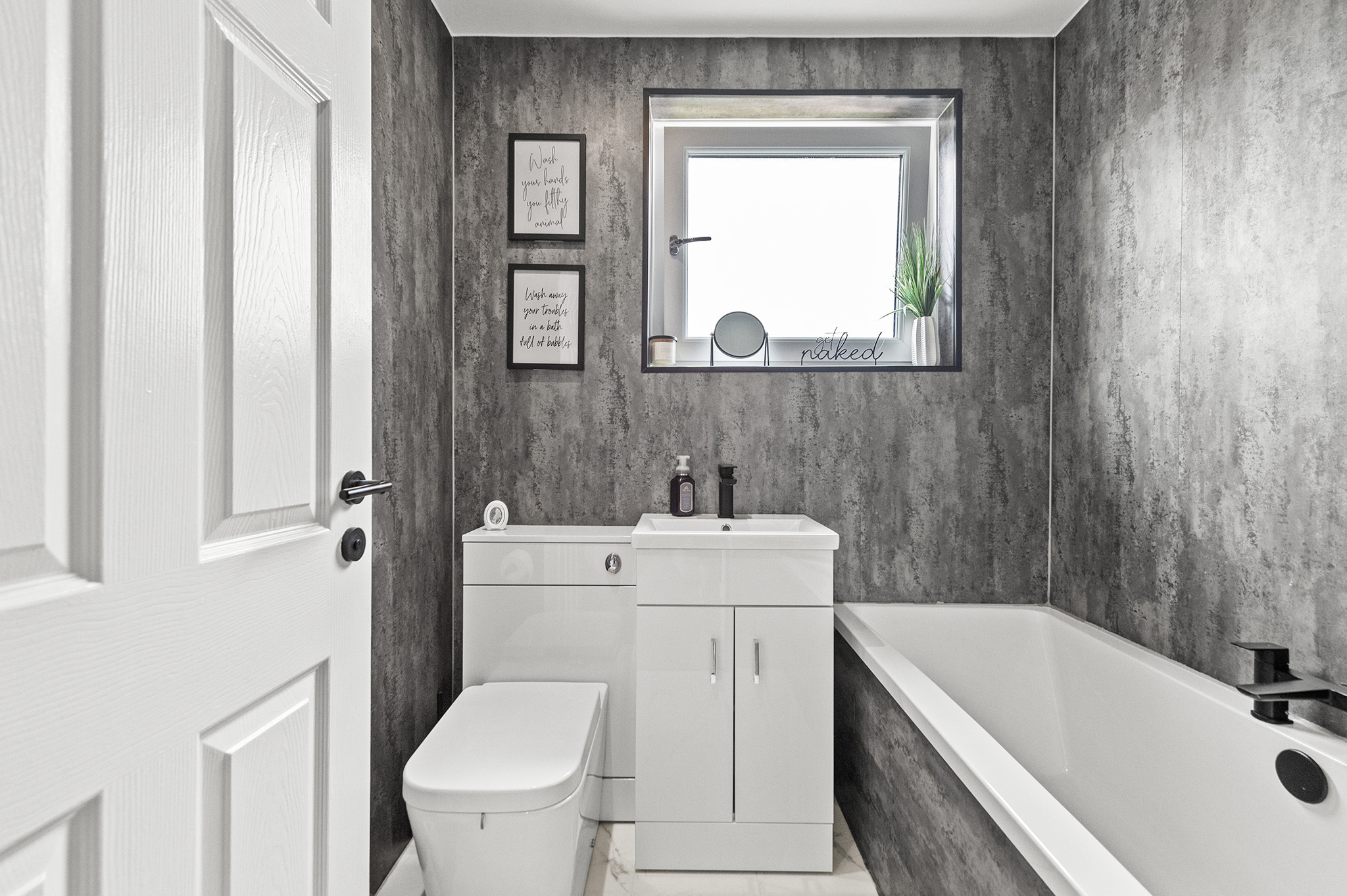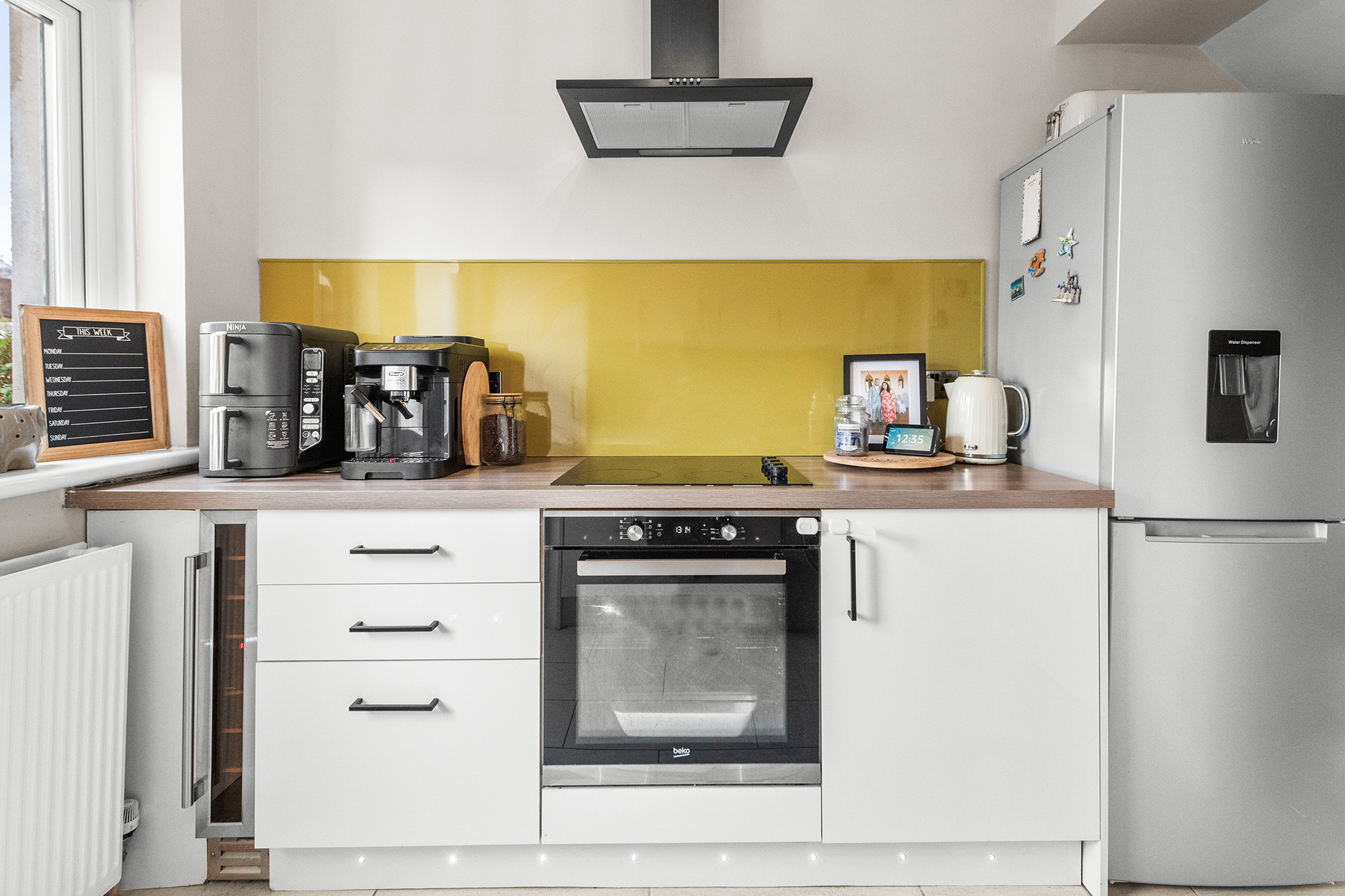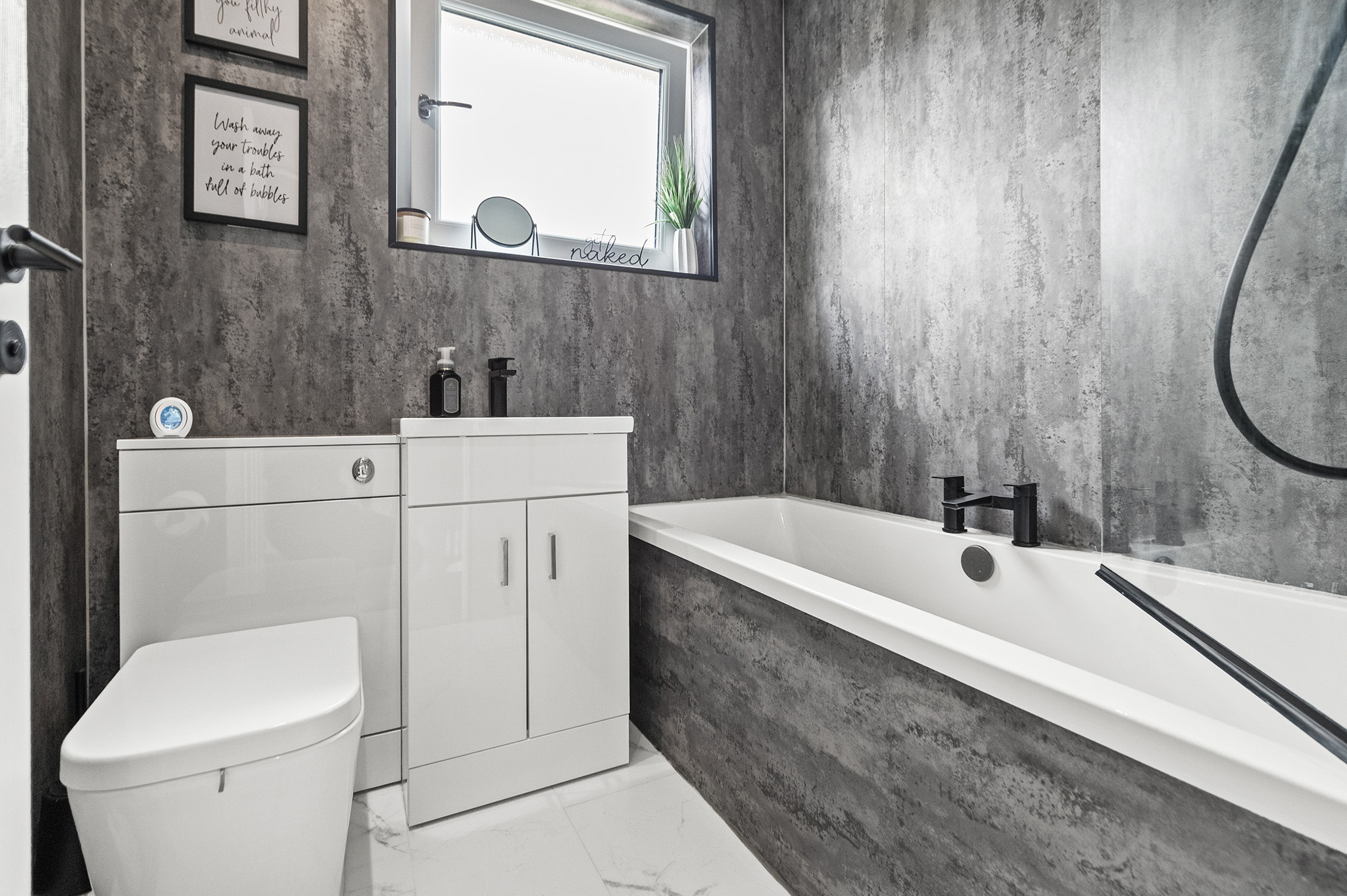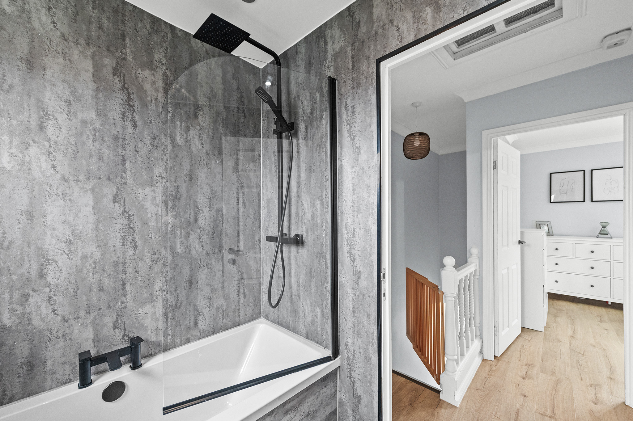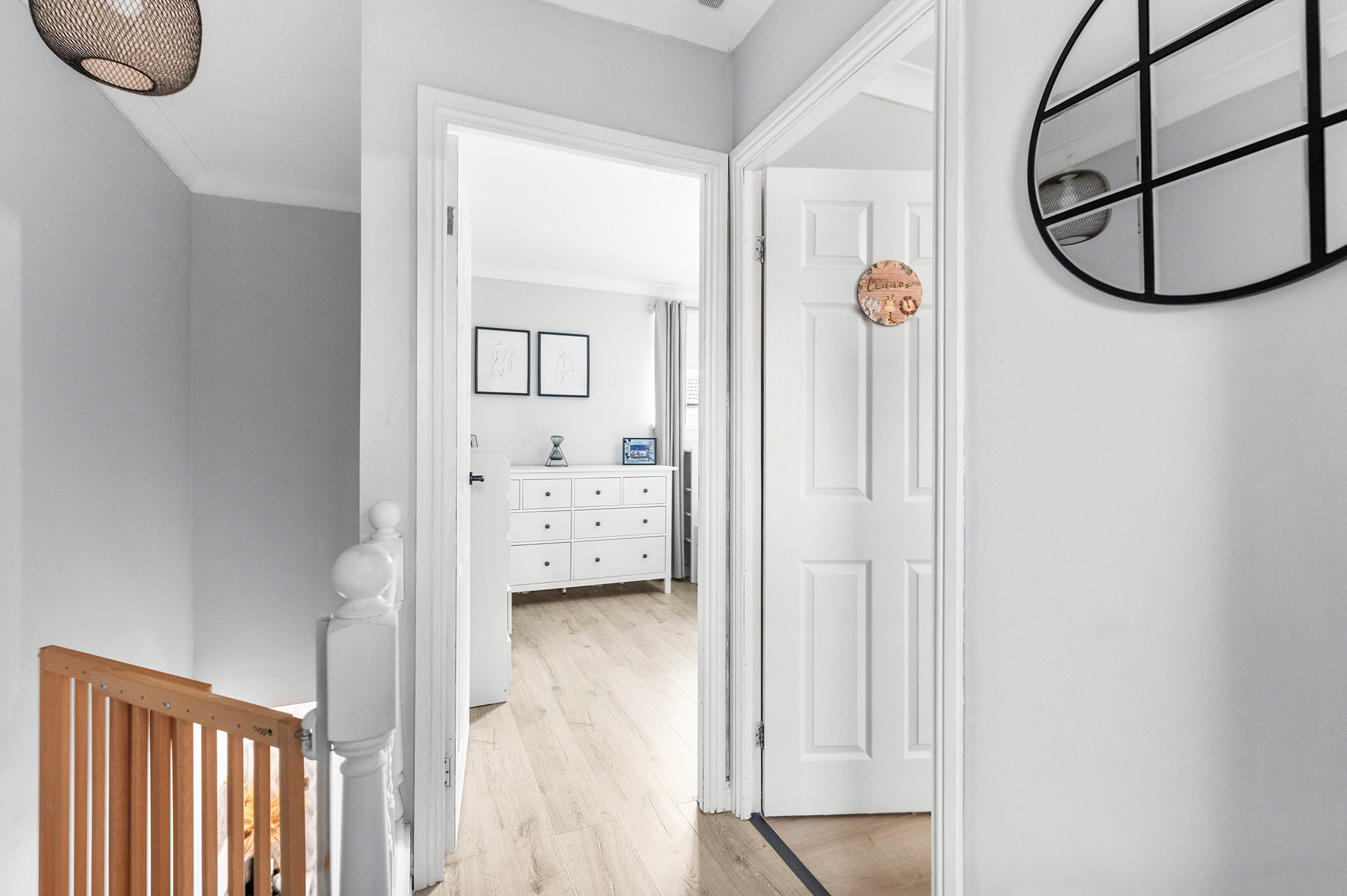 The upper level boasts two generously proportioned double bedrooms, both benefiting from built-in storage. A contemporary family bathroom completes the accommodation, providing a sleek and elegant space.