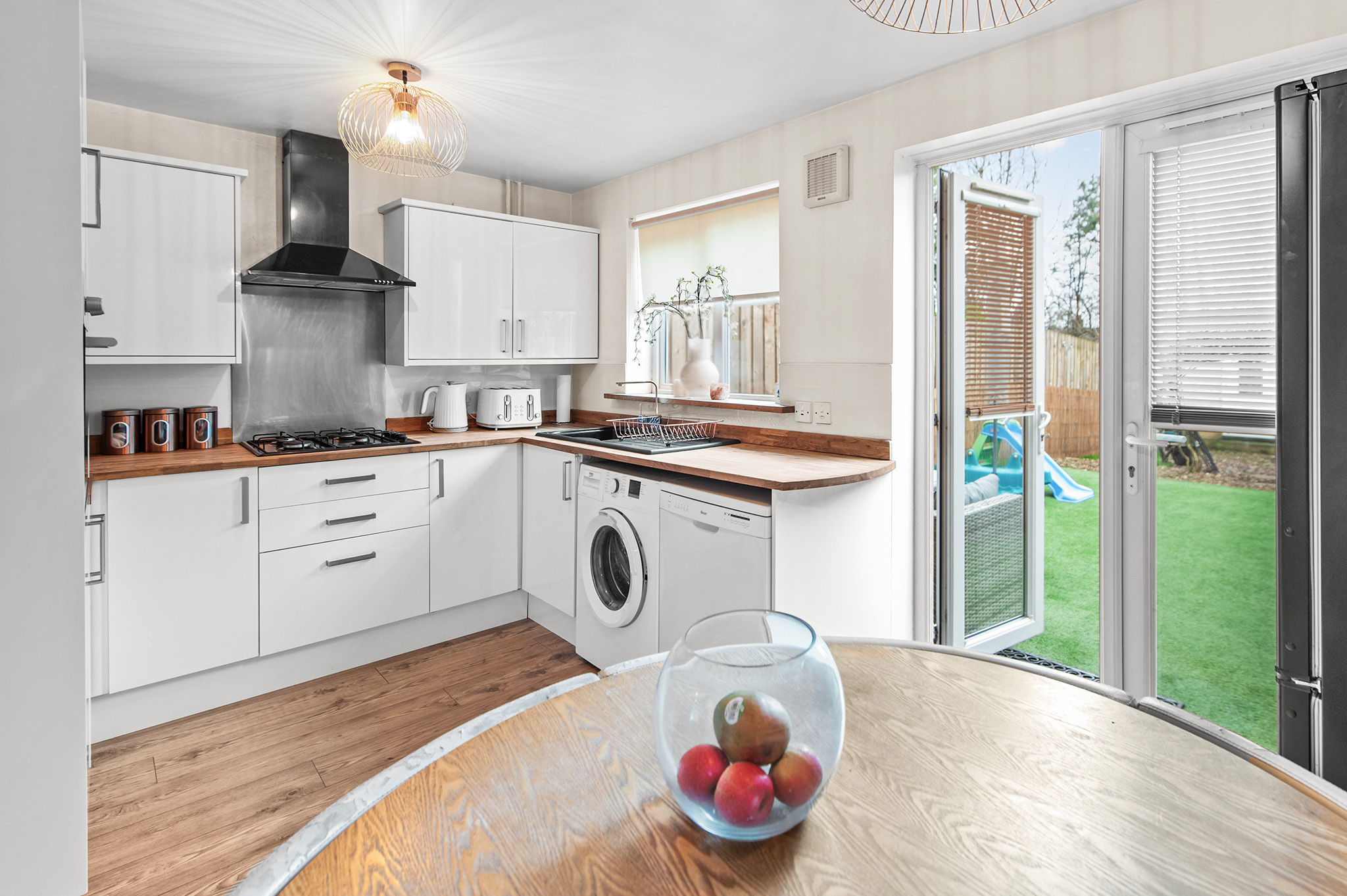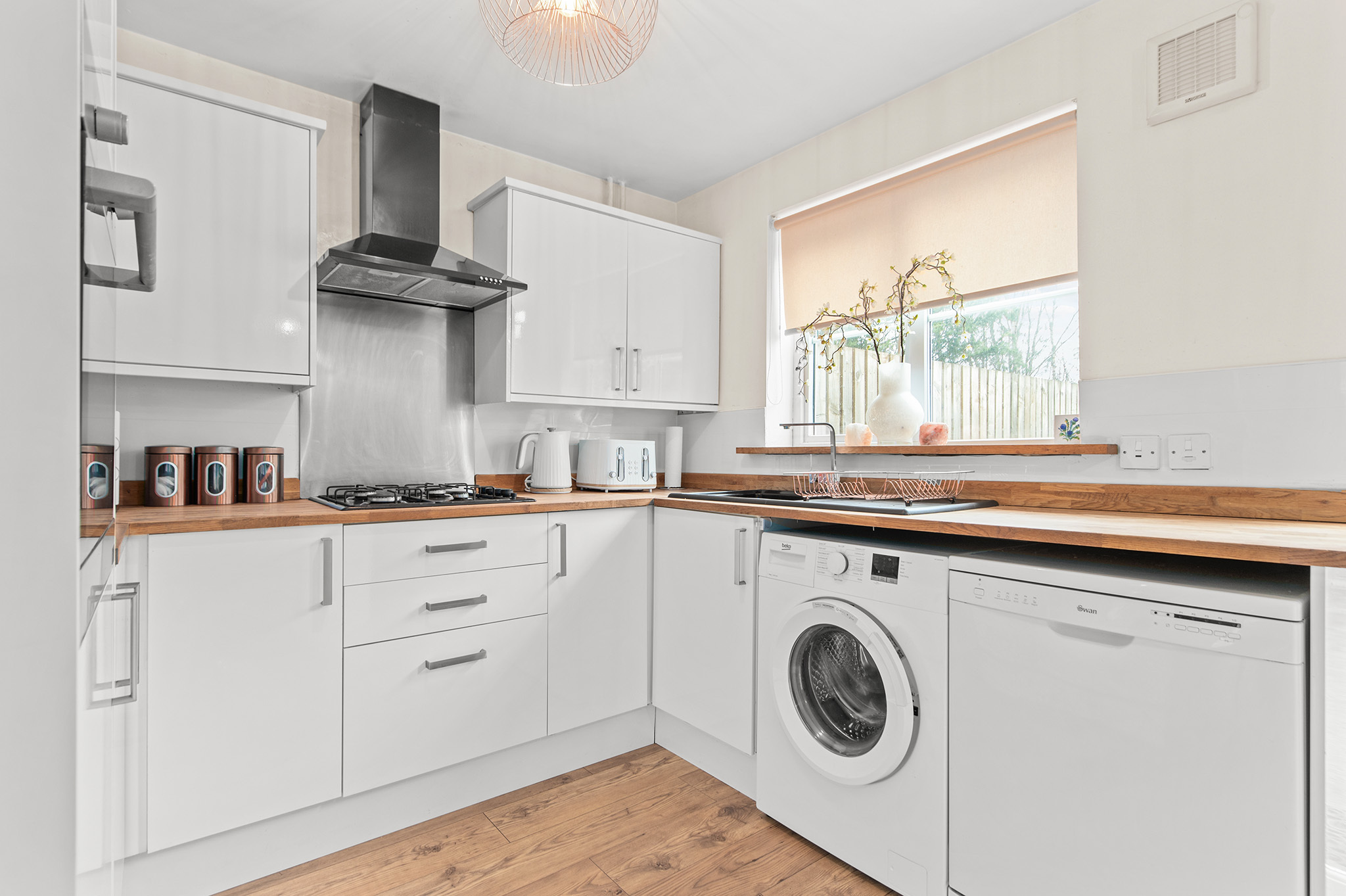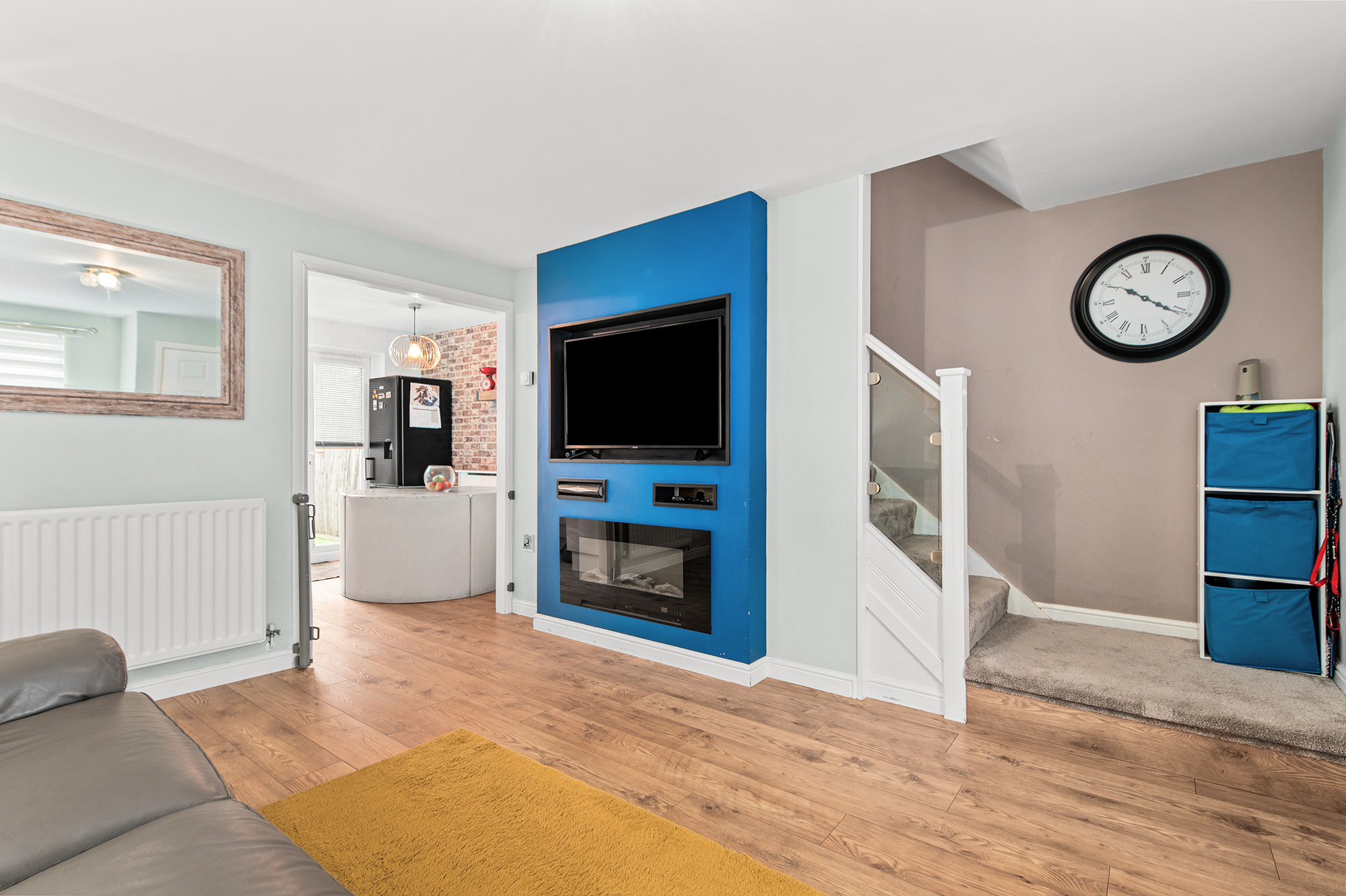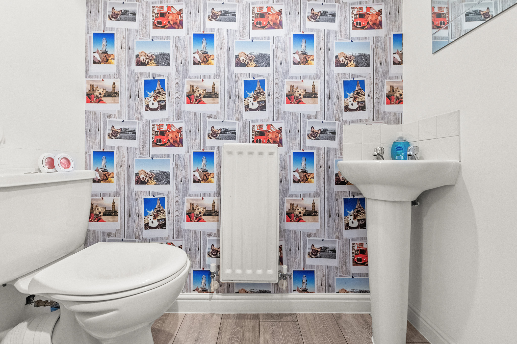 The home welcomes you with a bright and spacious lounge, featuring a stylish media wall. The well-appointed kitchen diner provides ample worktop and storage space, with French doors leading directly to the rear garden. A convenient WC and additional storage complete the ground floor.
