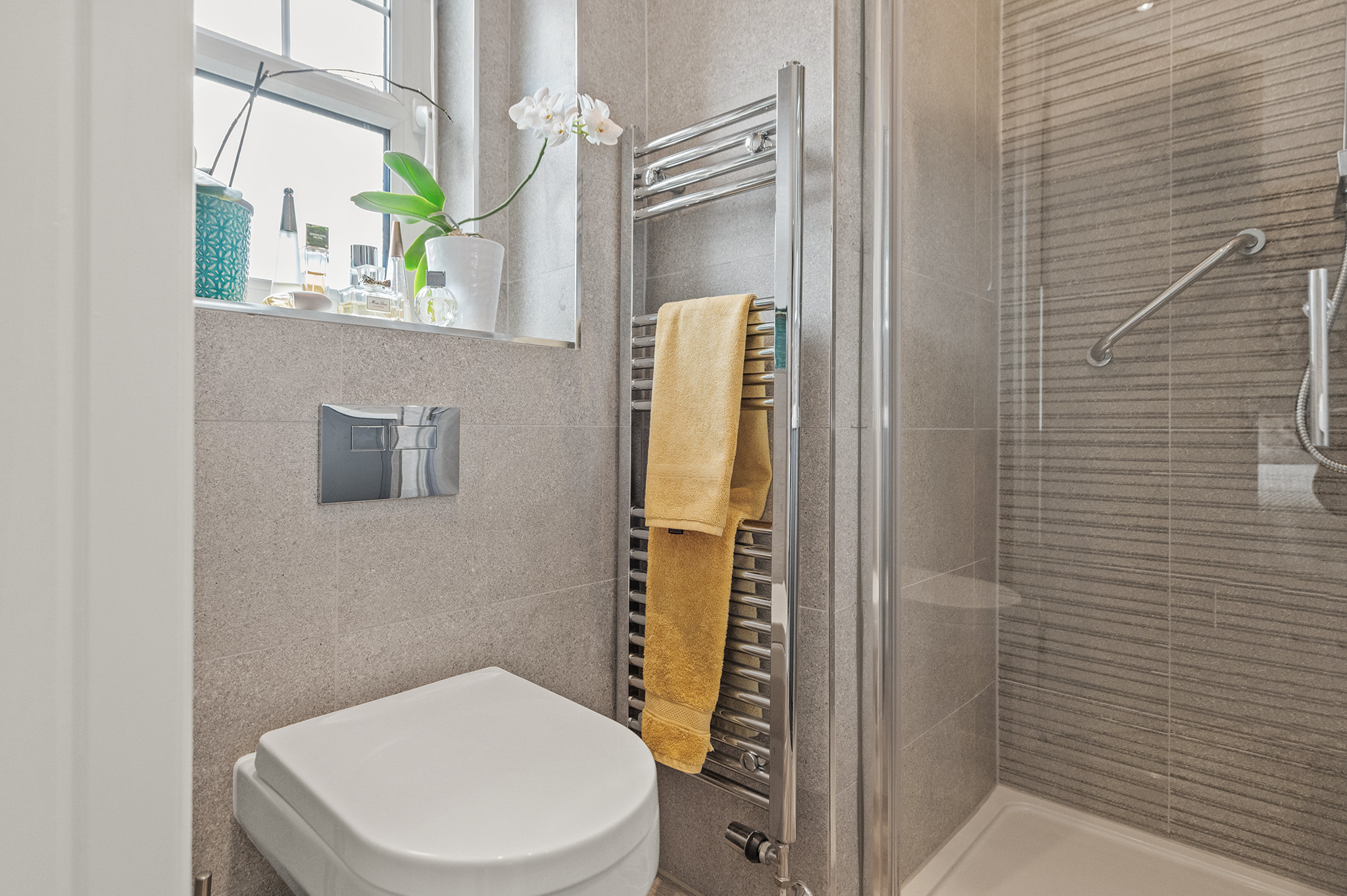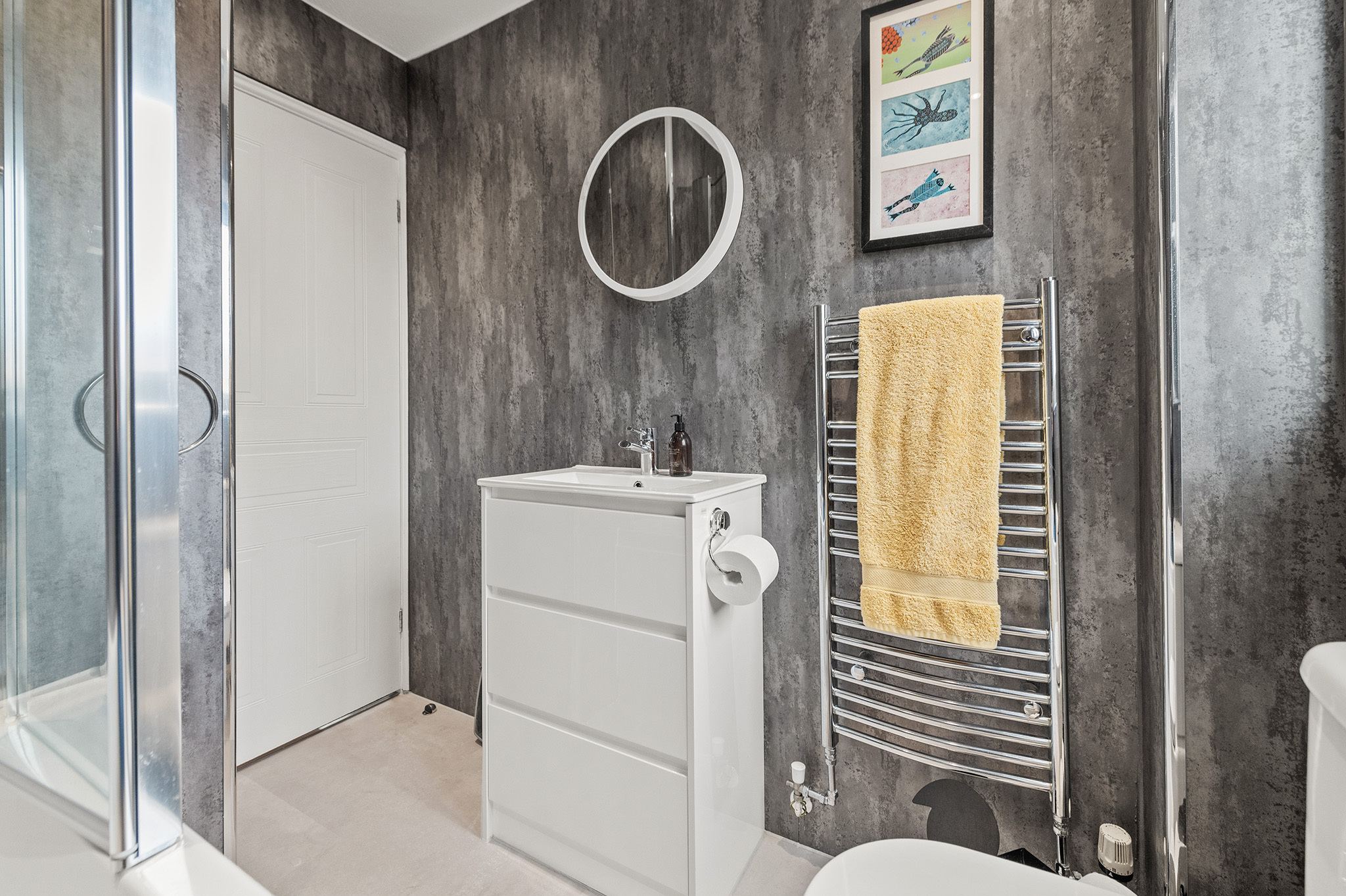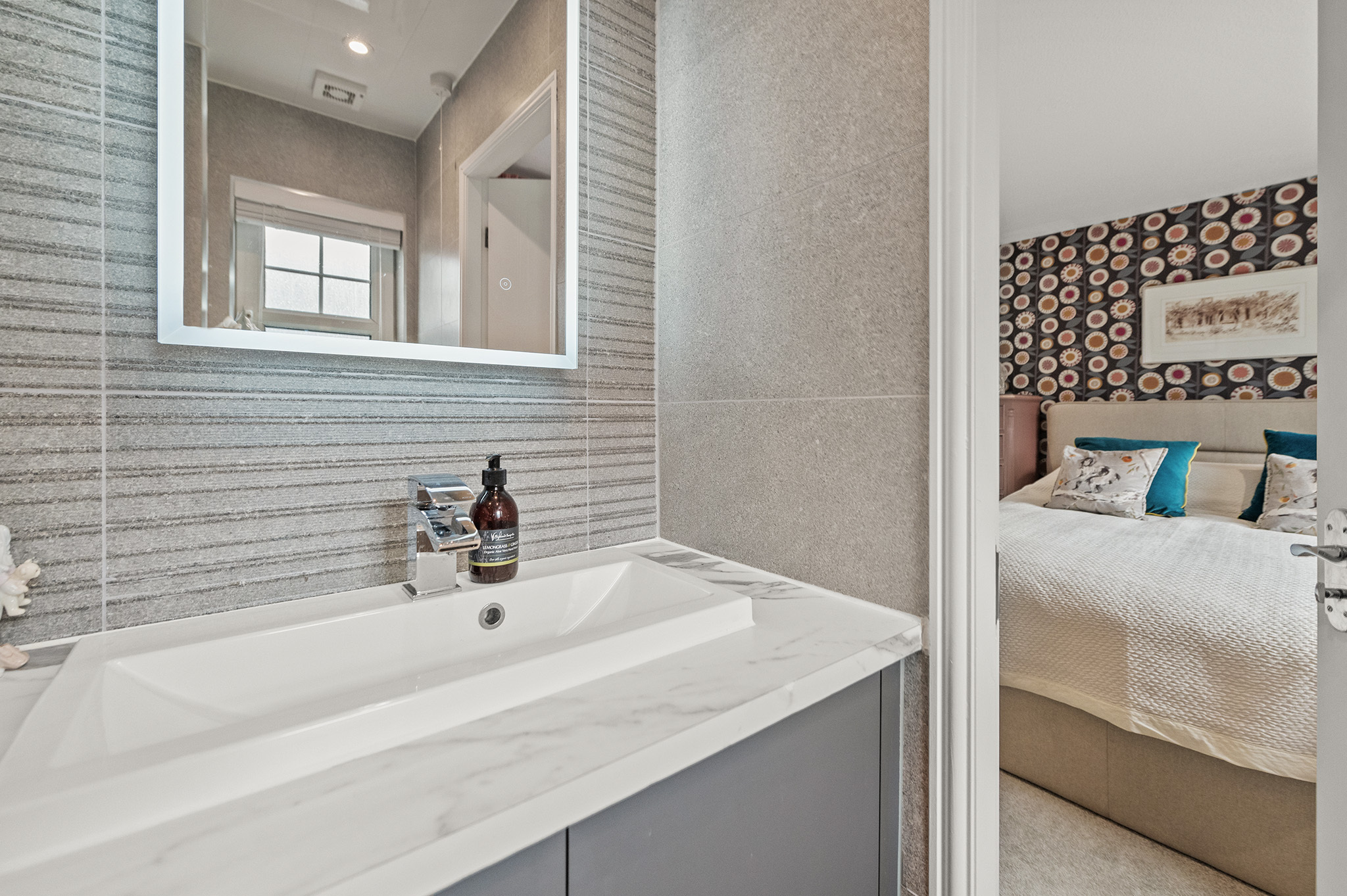 Primary bedroom benefits from a sleek en-suite shower room.