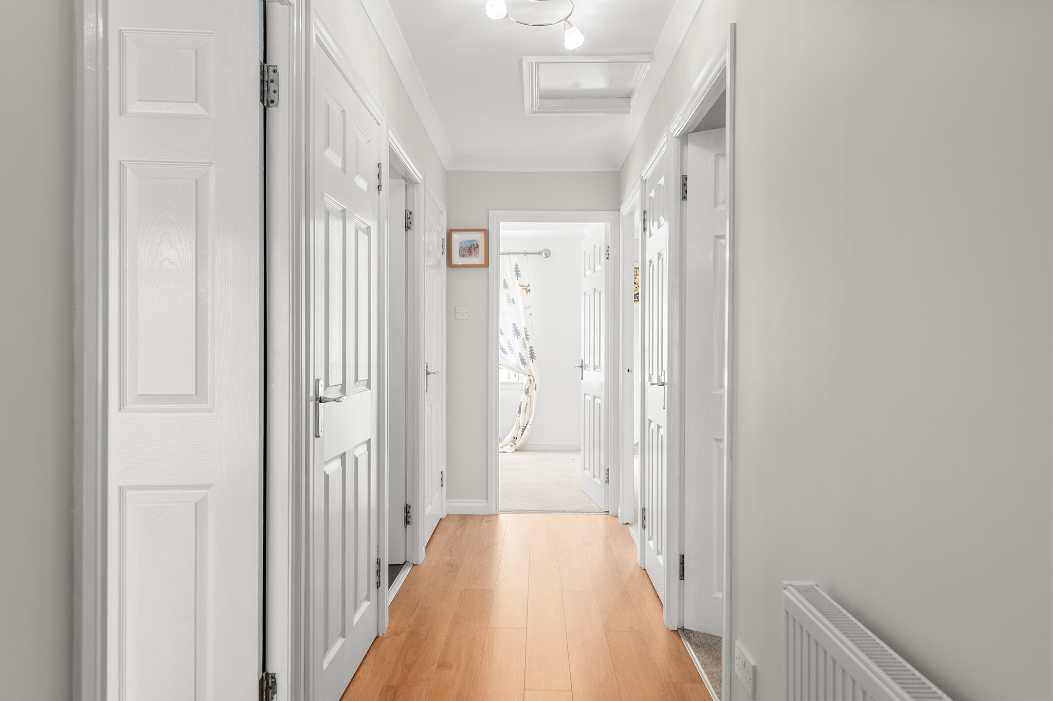 Three further bedrooms include two generous doubles, one with fitted wardrobes. The stunning and spacious family bathroom boasts a sleek white suite and full tiling, while a handy WC adds extra practicality.