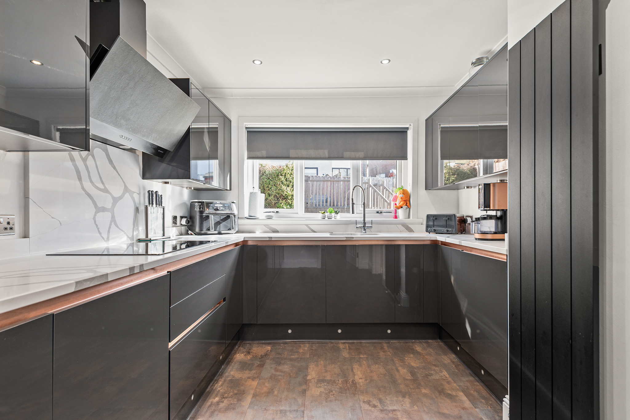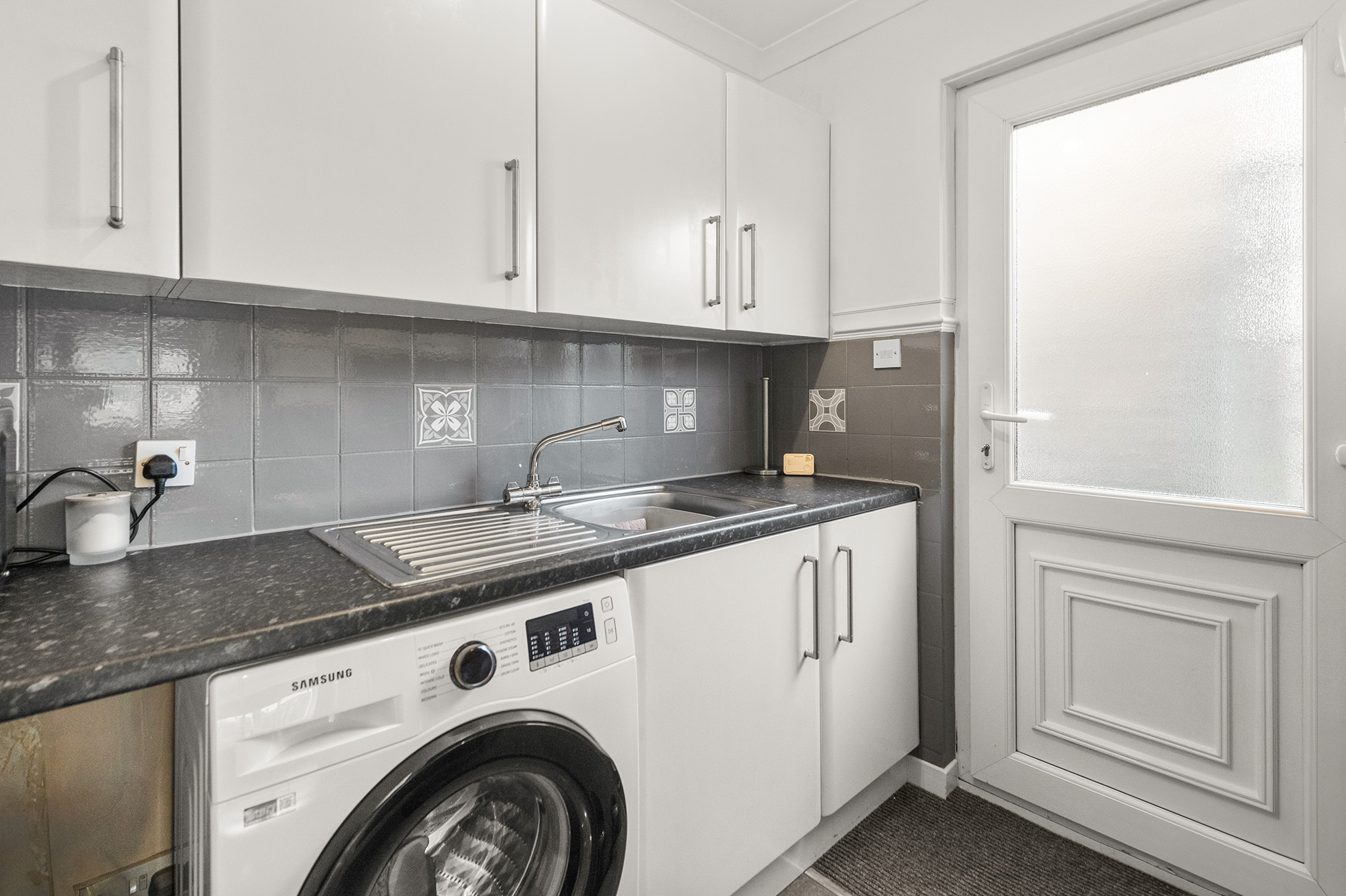 The beautifully presented kitchen features ample storage, integrated appliances, and a modern finish, while the separate utility room provides additional convenience for laundry and household essentials.