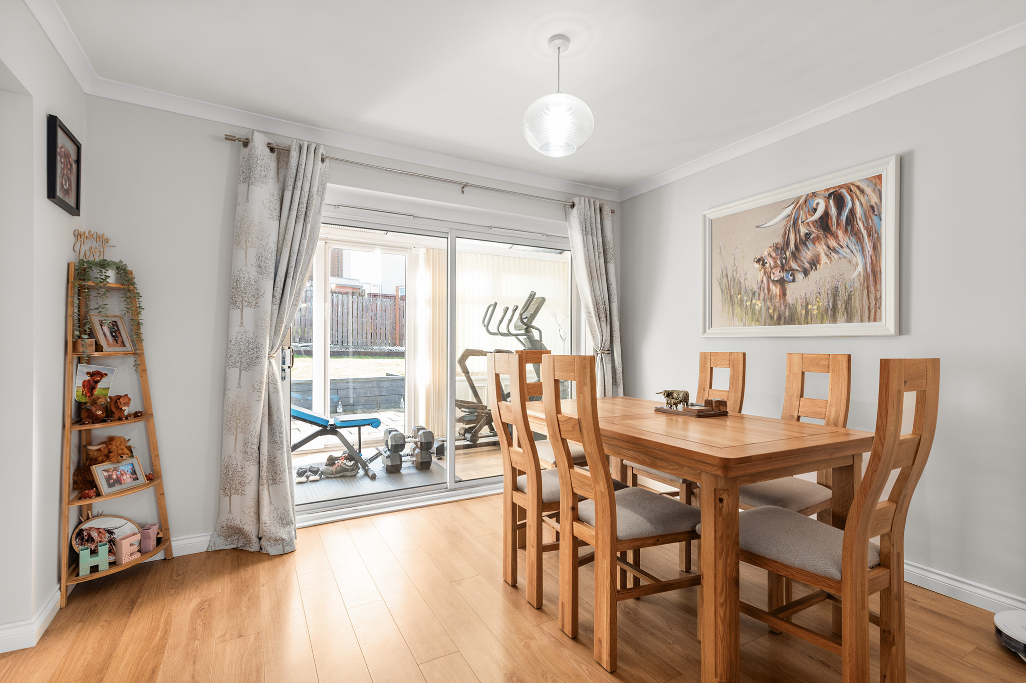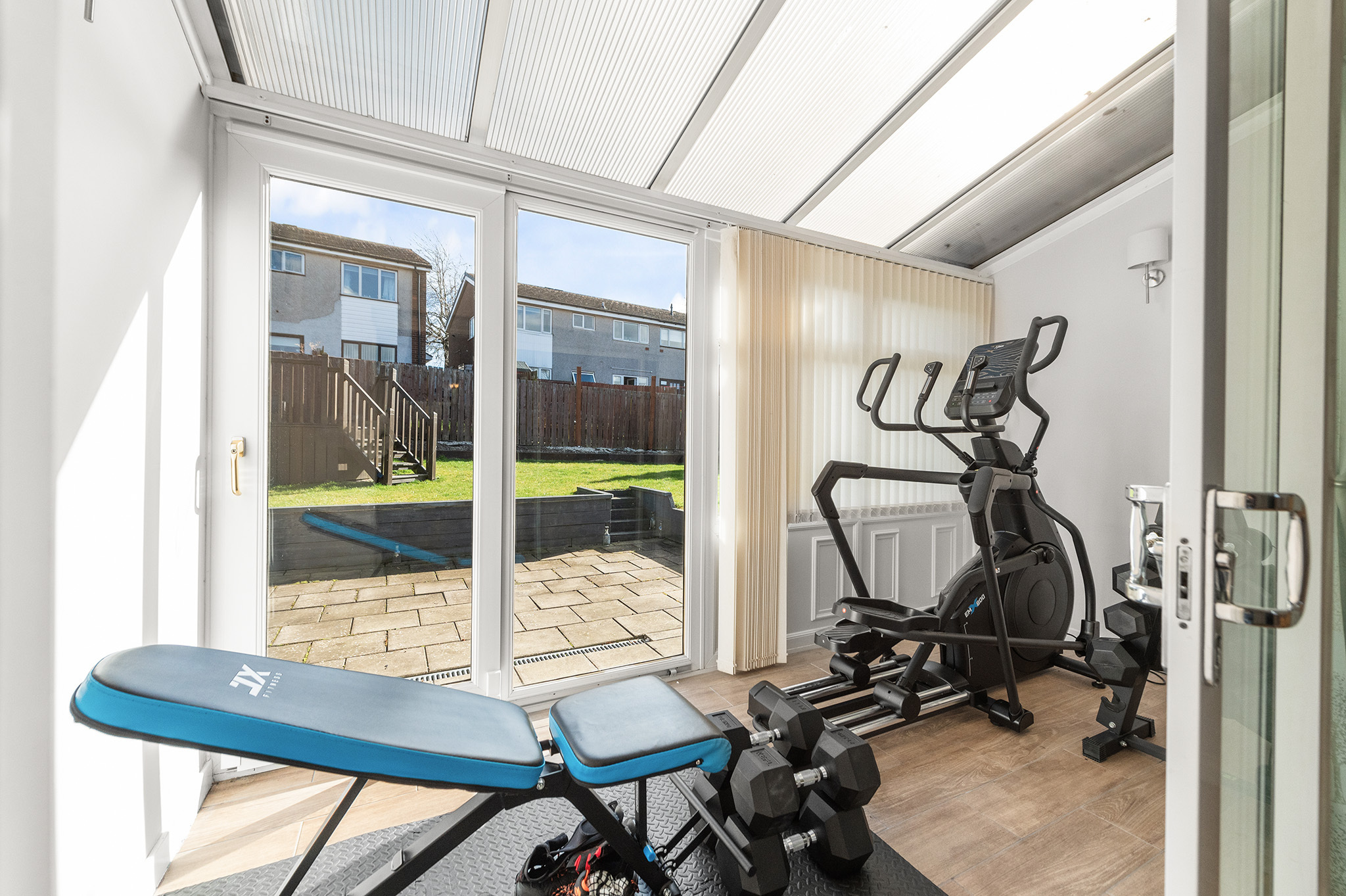 The expansive open-plan lounge and dining area is flooded with natural light, creating a warm and inviting setting. Patio doors lead seamlessly into the sunroom, currently used as a gym but offering fantastic potential as a family or relaxation space.