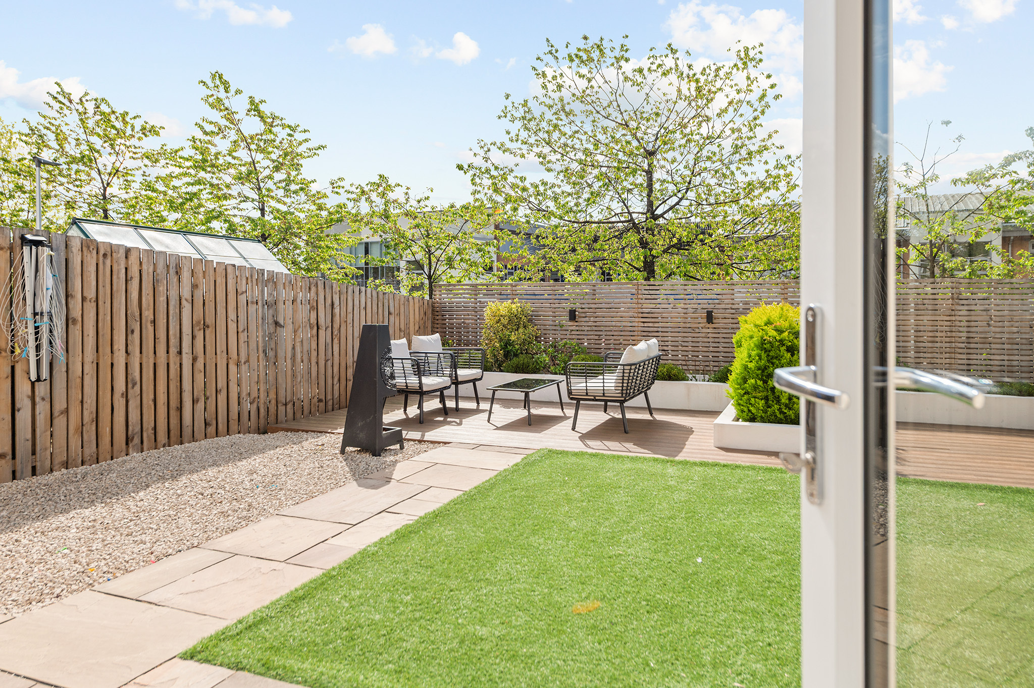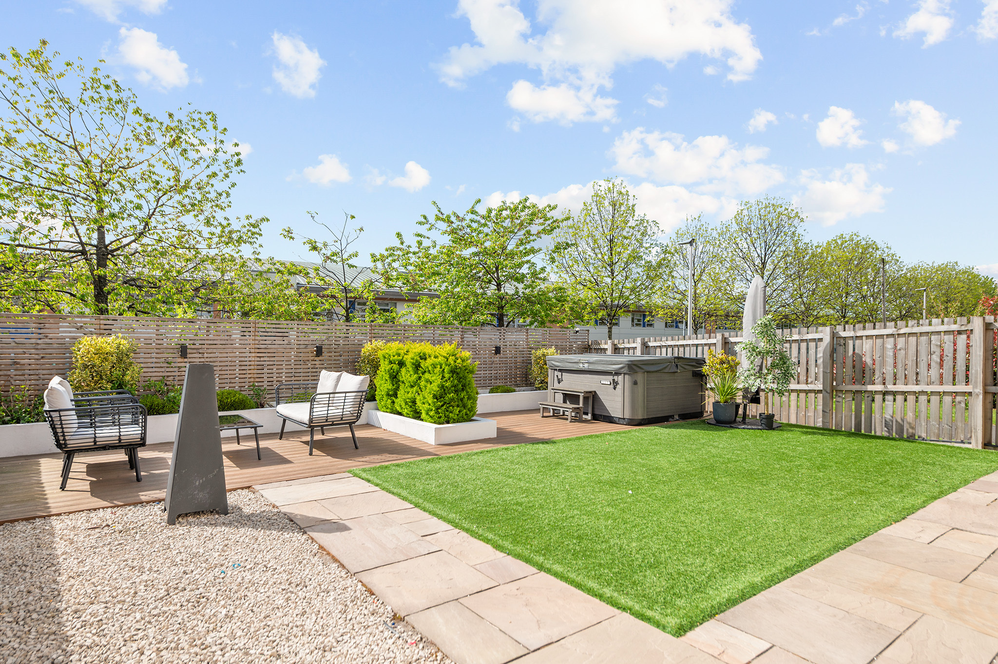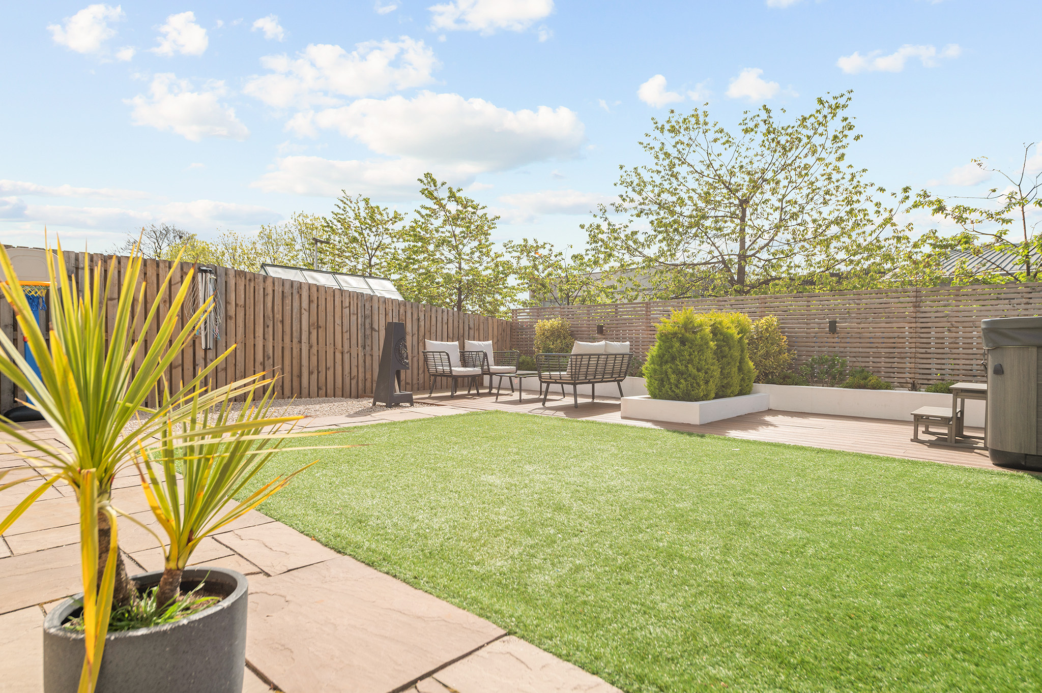 Exceptional landscaped gardens to the front and rear, featuring premium artificial lawn, a patio area, contemporary raised planters, and composite decking – all designed for low-maintenance outdoor enjoyment.