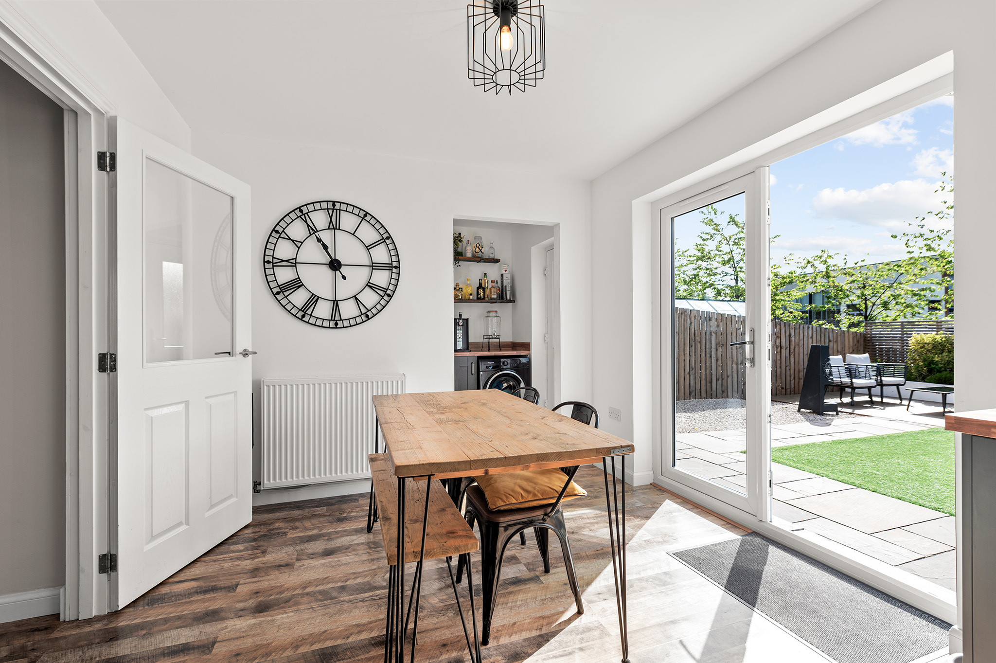 Contemporary open-plan kitchen/dining area with high-spec fittings and integrated appliances, complemented by French doors leading out to the rear garden.