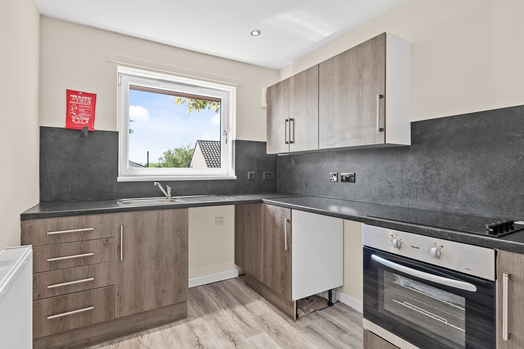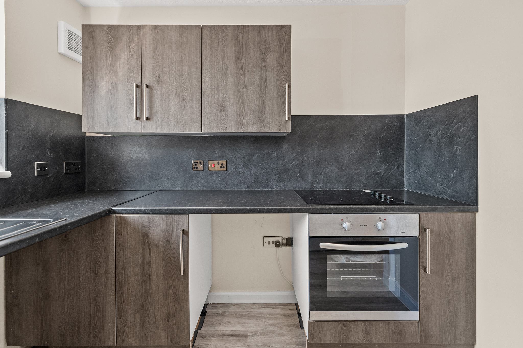 Stylish new breakfasting kitchen featuring generous worktop space, plentiful storage, and integrated oven and hob.