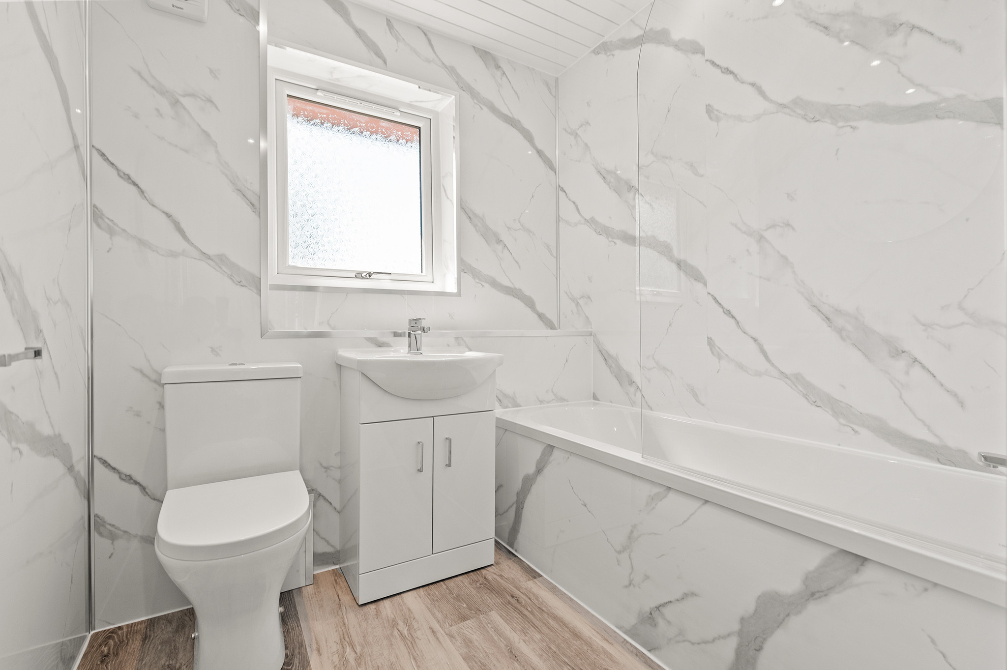 Contemporary bathroom, beautifully finished with wet wall panels, shower-over-bath, and modern fixtures.