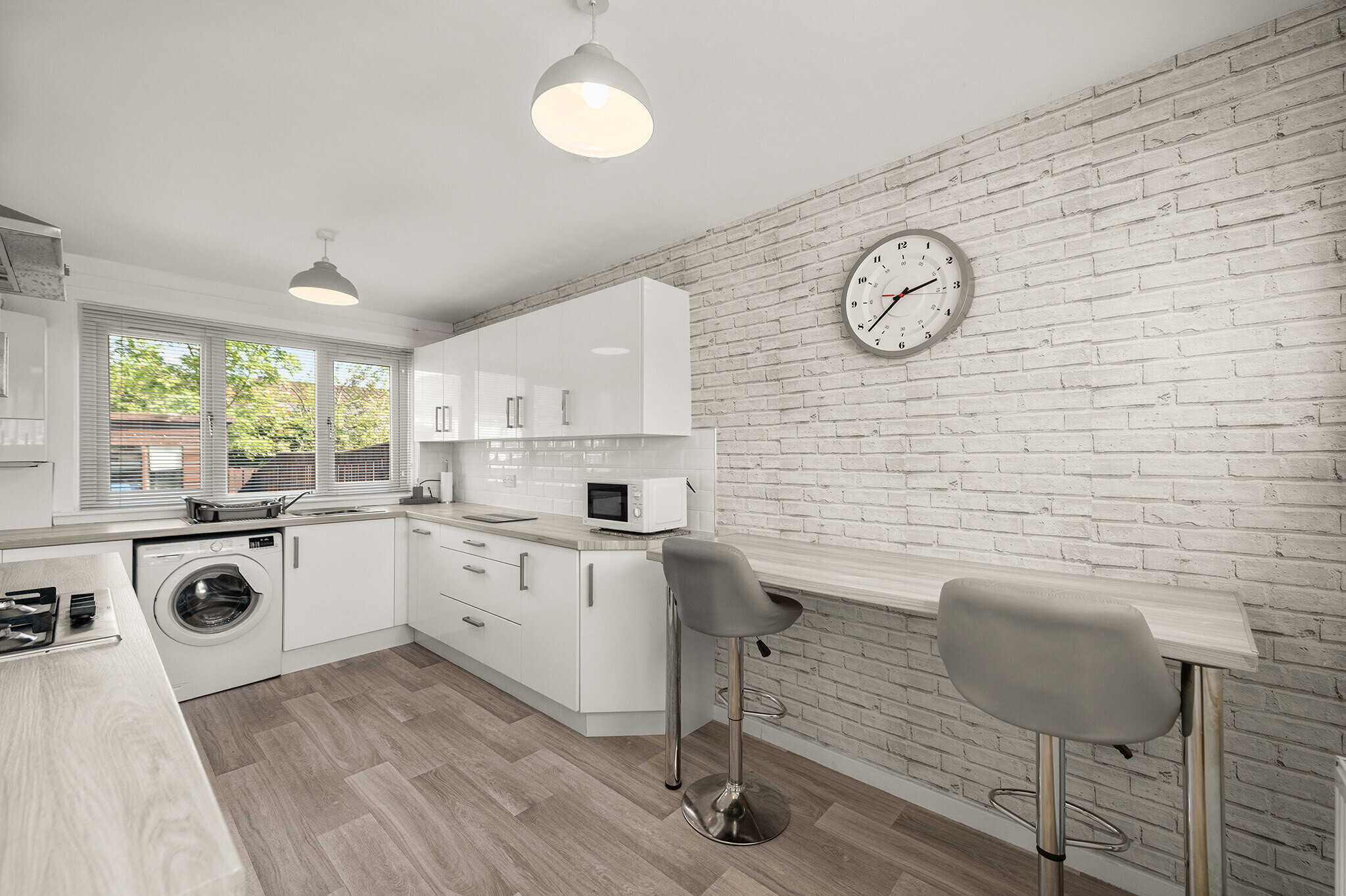 Generously proportioned breakfasting kitchen, also benefiting from dual-aspect windows, modern units, and ample space for casual dining and entertaining.