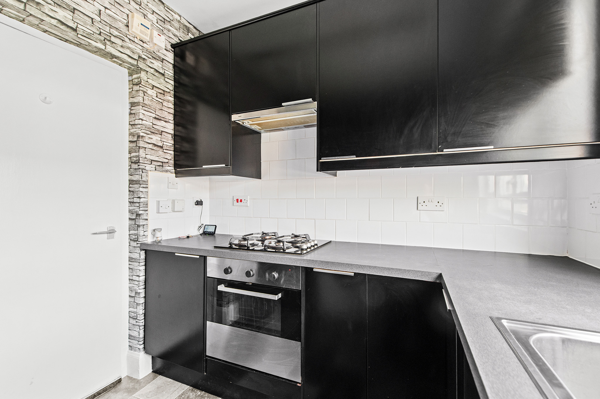 Functional kitchen with ample cupboard space and room for appliances