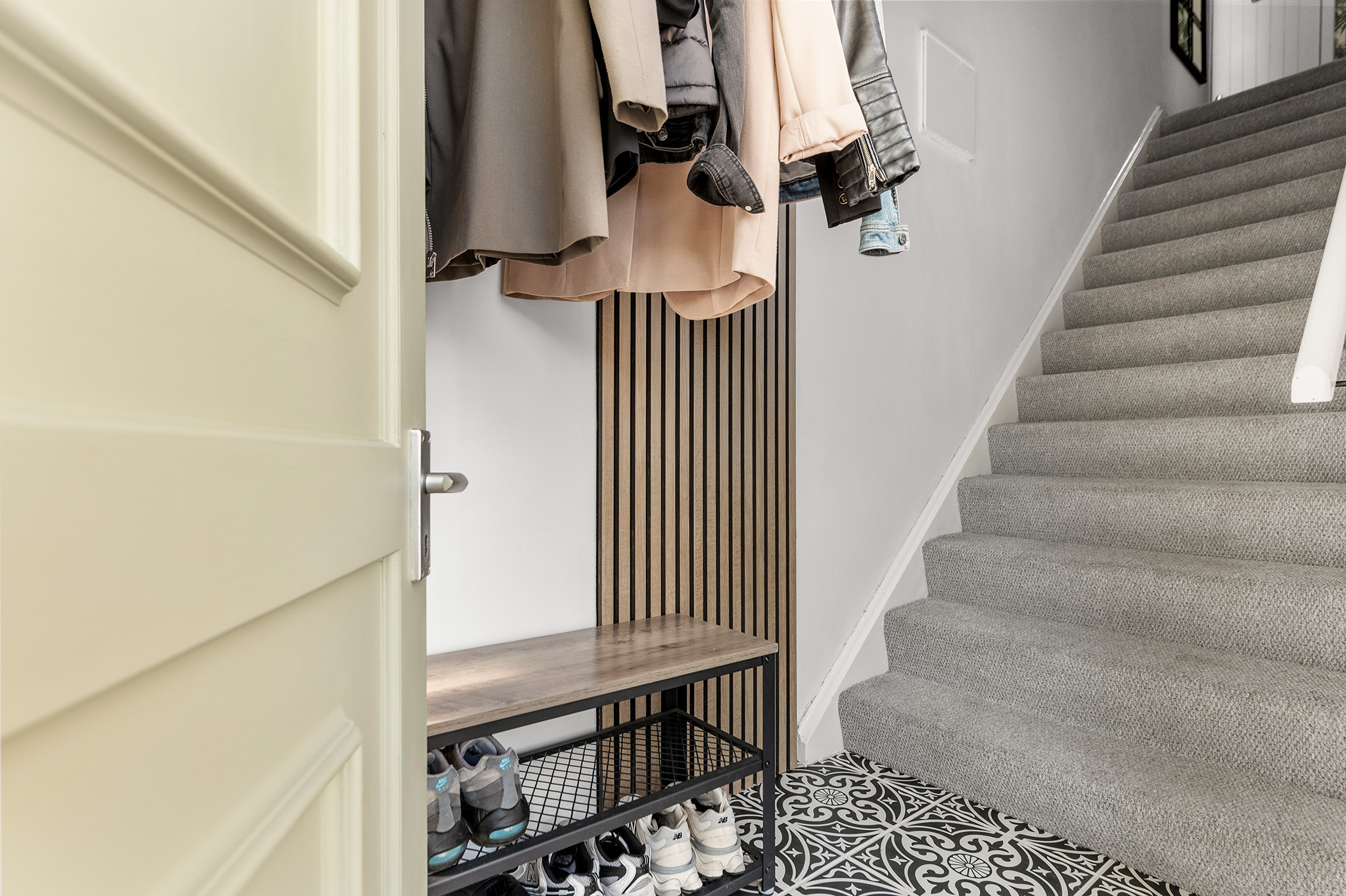Welcoming entrance vestibule and stairway leading to a bright and spacious hallway.