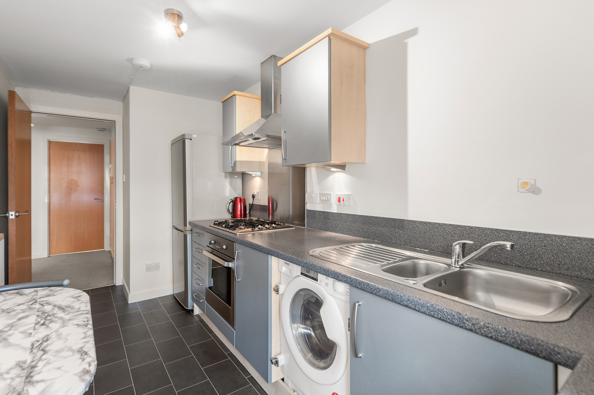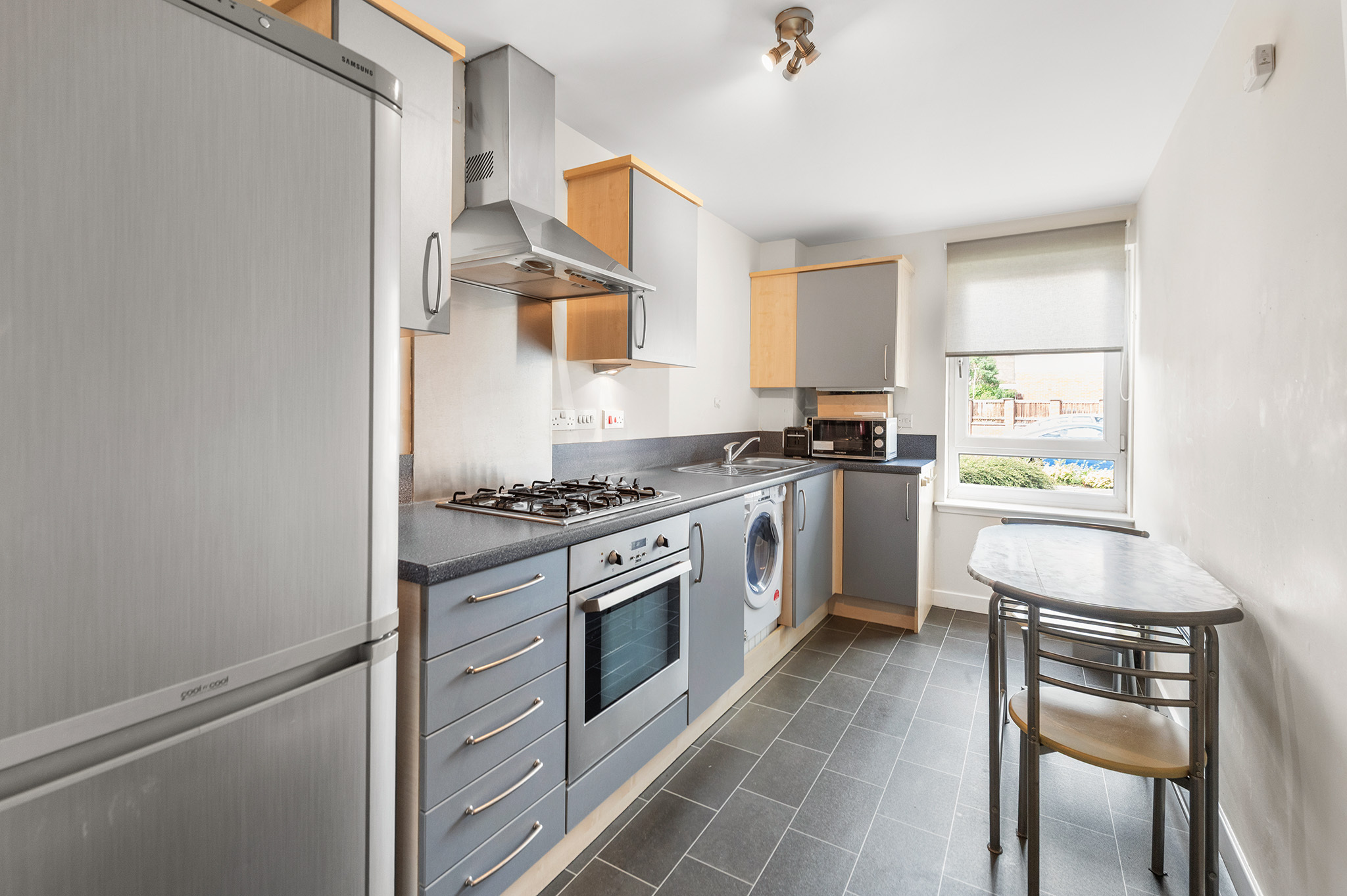 Well-equipped kitchen featuring stylish grey wall and base units, black speckled worktops, integrated gas hob, electric oven with extractor, washing machine, and space for fridge/freezer. Rear-facing window and breakfasting space add further practicality.