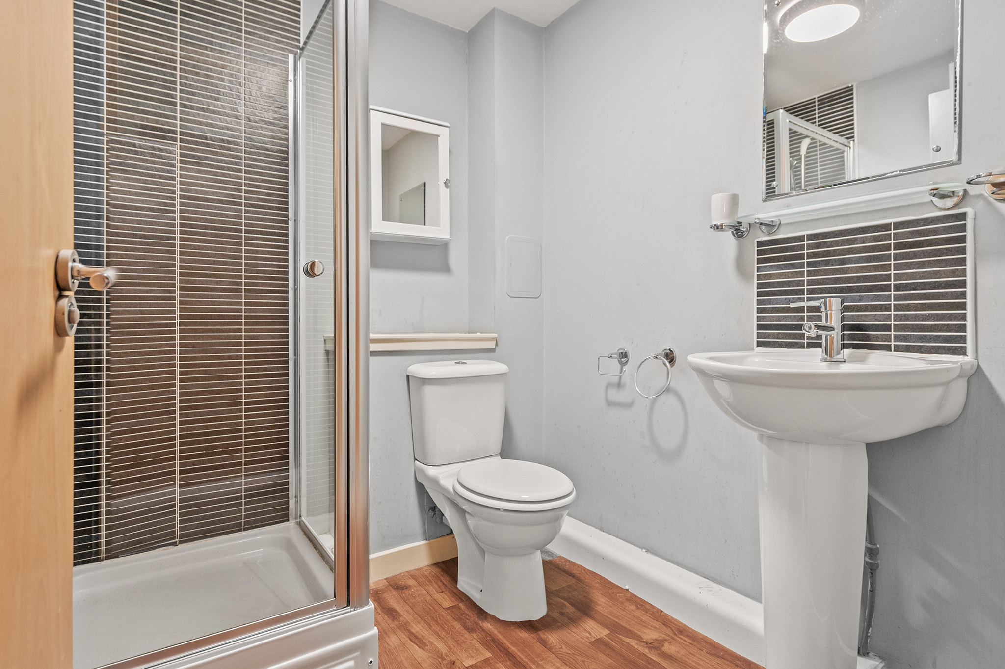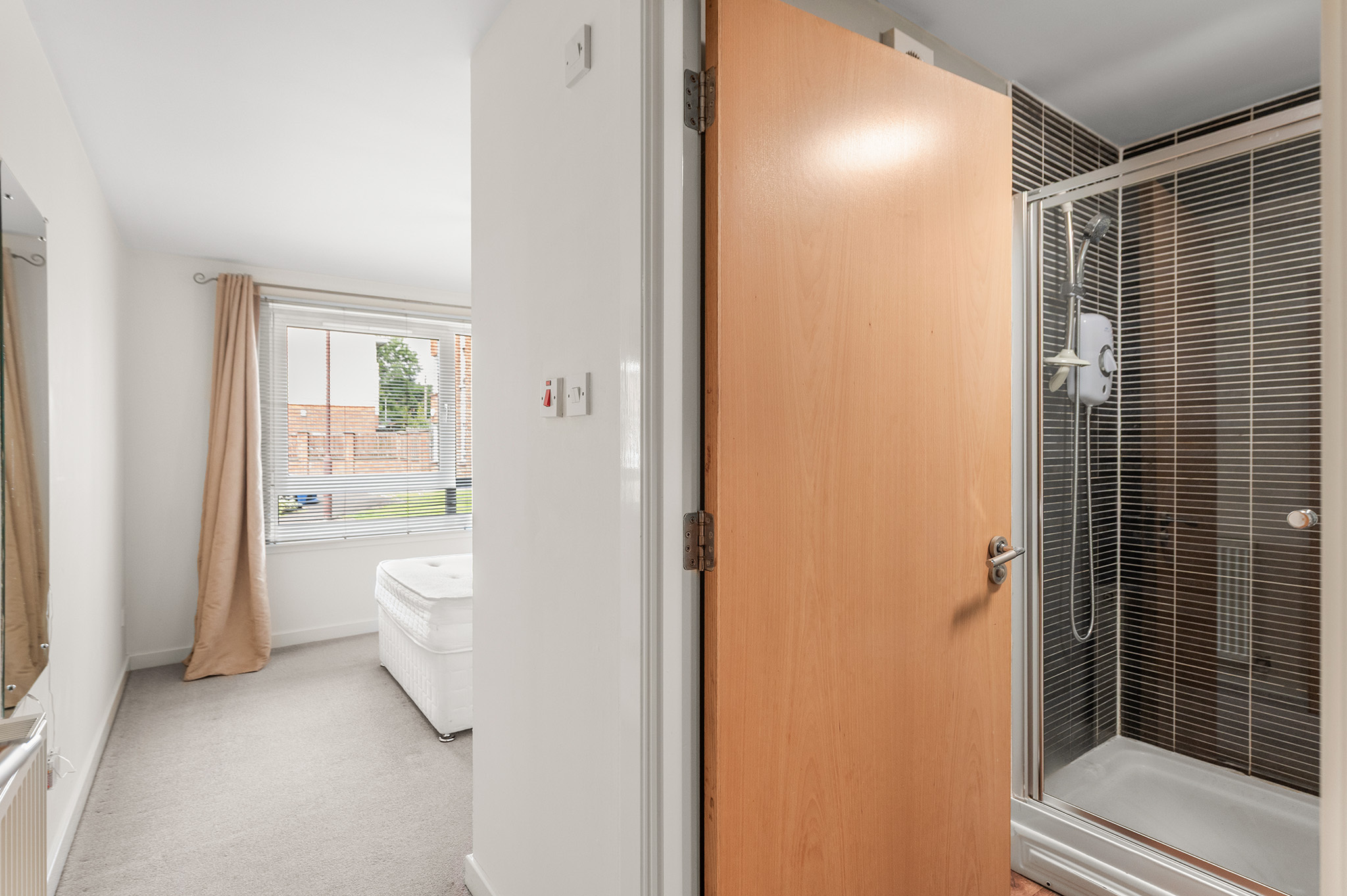 Comfortable double bedroom with built-in wardrobe, soft carpeting, and rear-facing window. En-suite shower room includes WC, wash basin, and corner shower with electric unit.