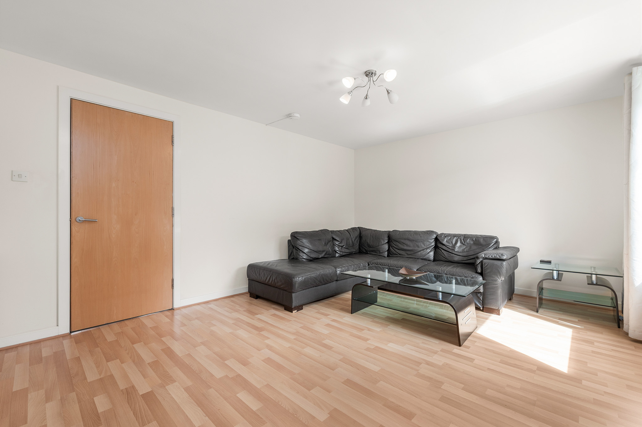 Generous living space with large front-facing window, wood-effect laminate flooring, and ample room for dining, ideal for relaxing or entertaining.