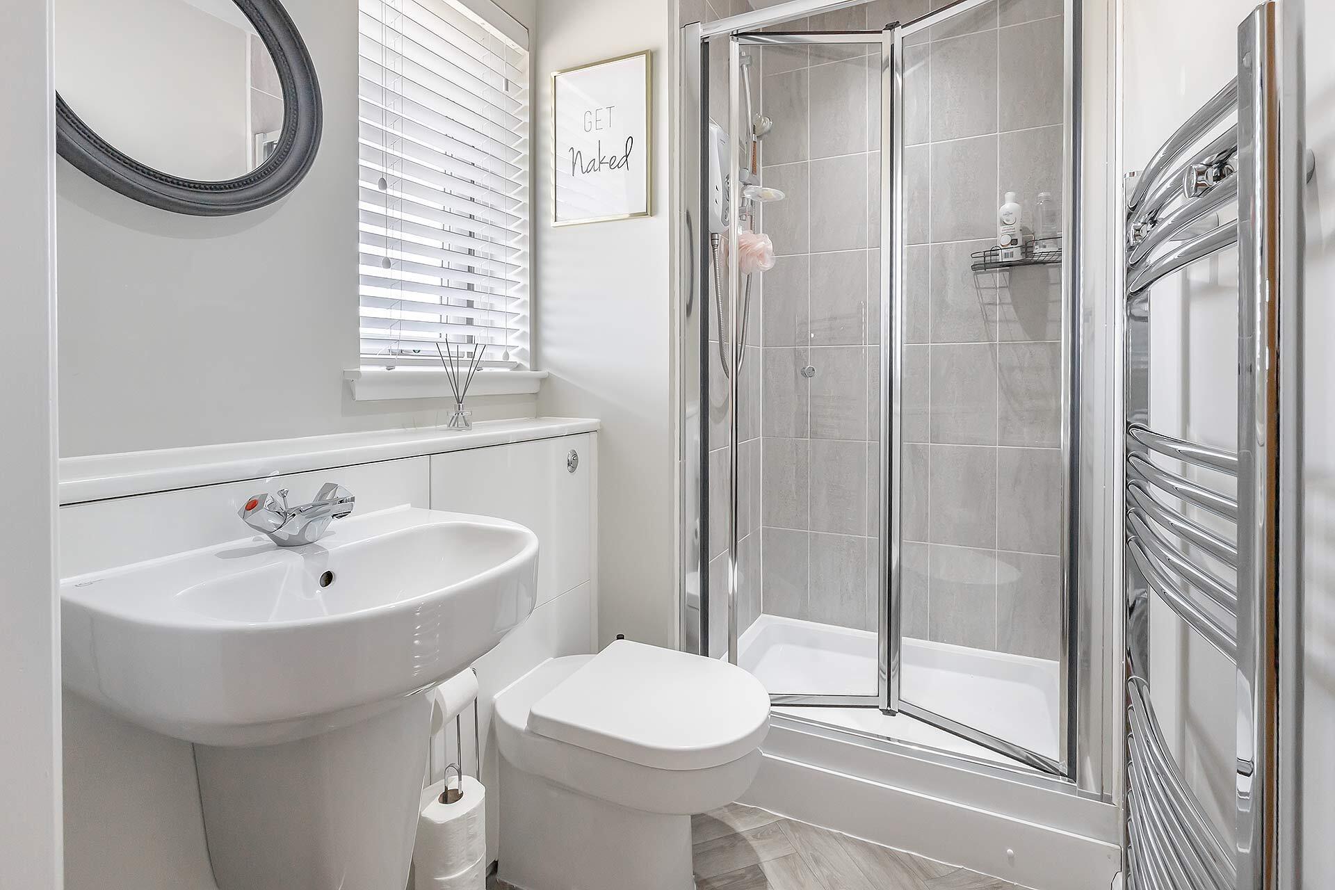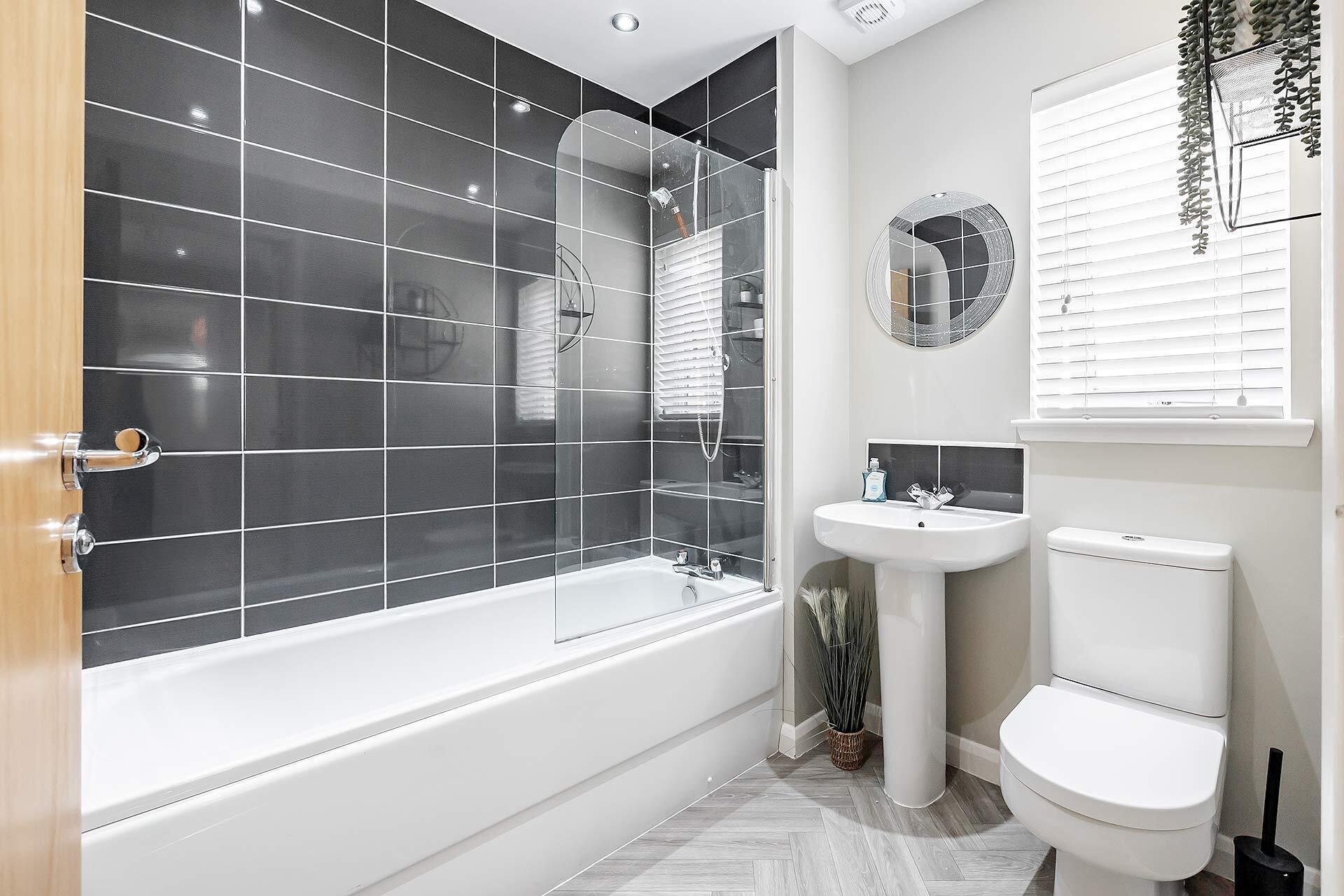Modern family bathroom complete with upgraded three-piece suite, shower over bath, and elegant tile finishes.