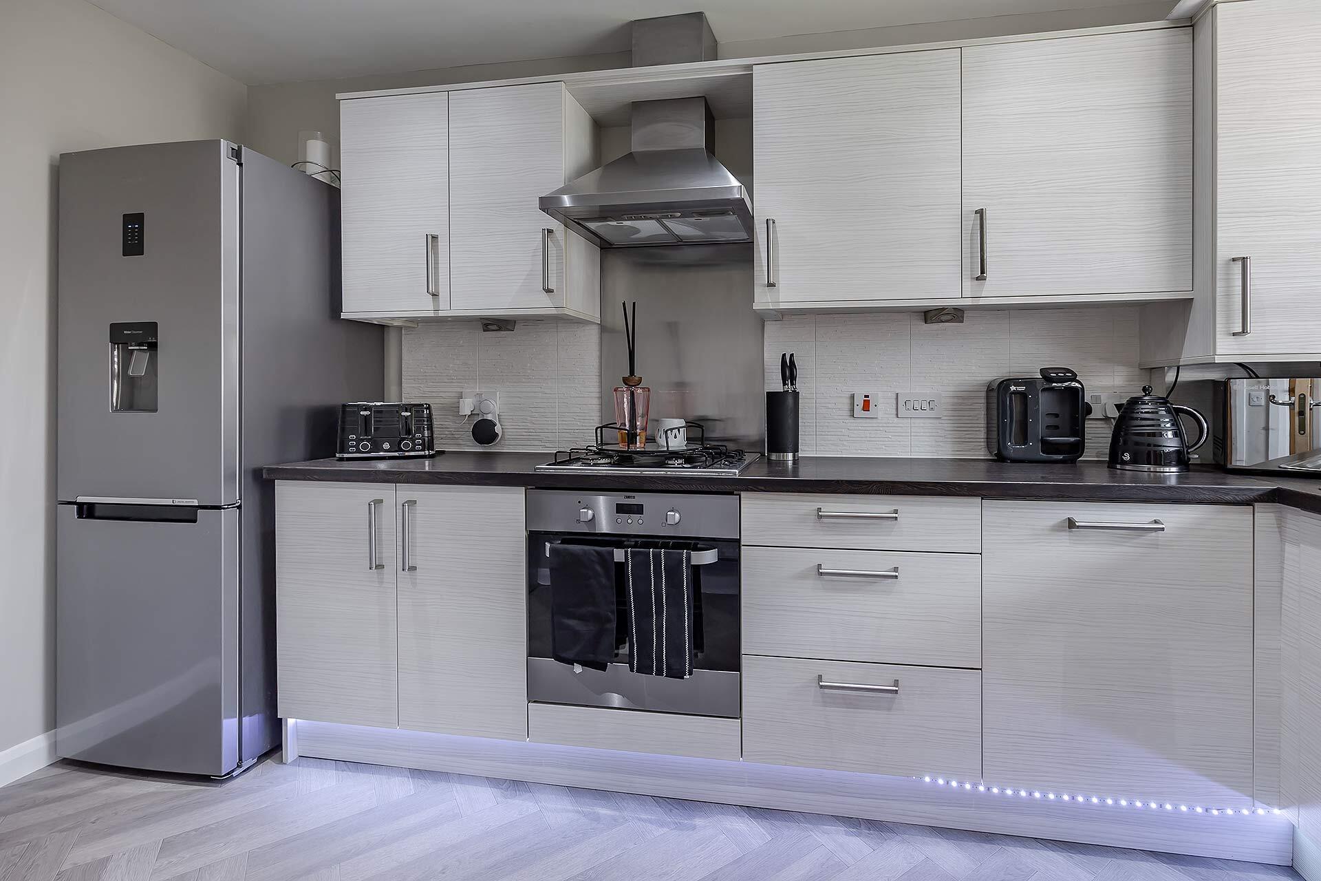 Stunning, modern kitchen featuring a wide range of base and wall units, integrated oven with gas hob, dishwasher, and washing machine, plus space for an additional appliance and informal dining.
