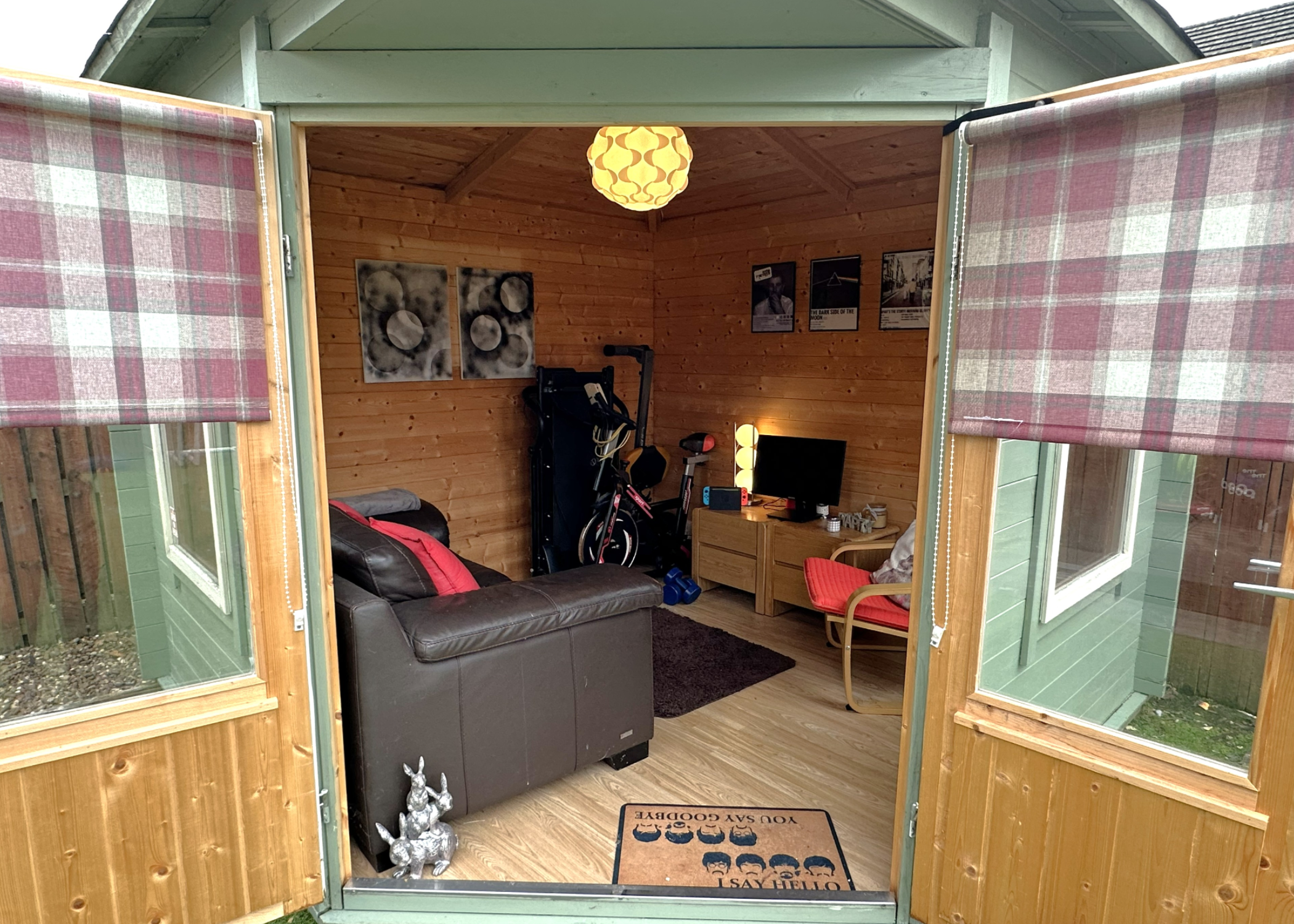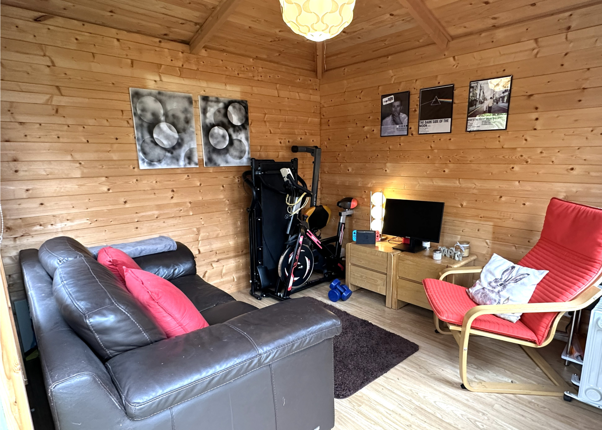 Expansive rear garden, mainly laid to lawn, featuring a summer house, garden shed, and slabbed patio area, perfect for outdoor living and entertaining.