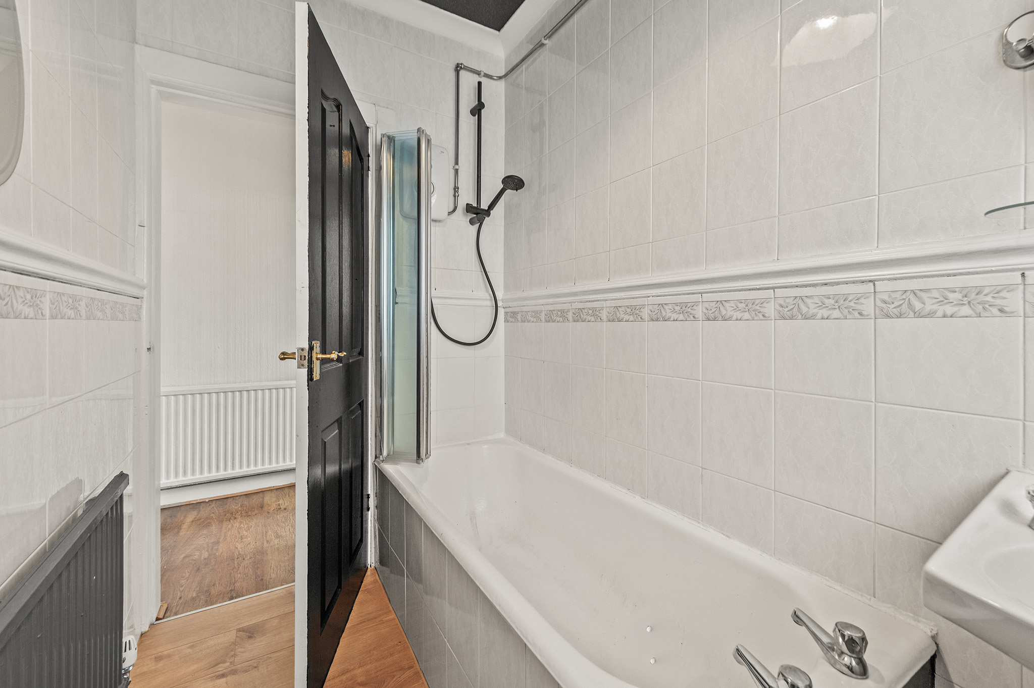 Modern three-piece suite with shower over bath and contemporary finishes.