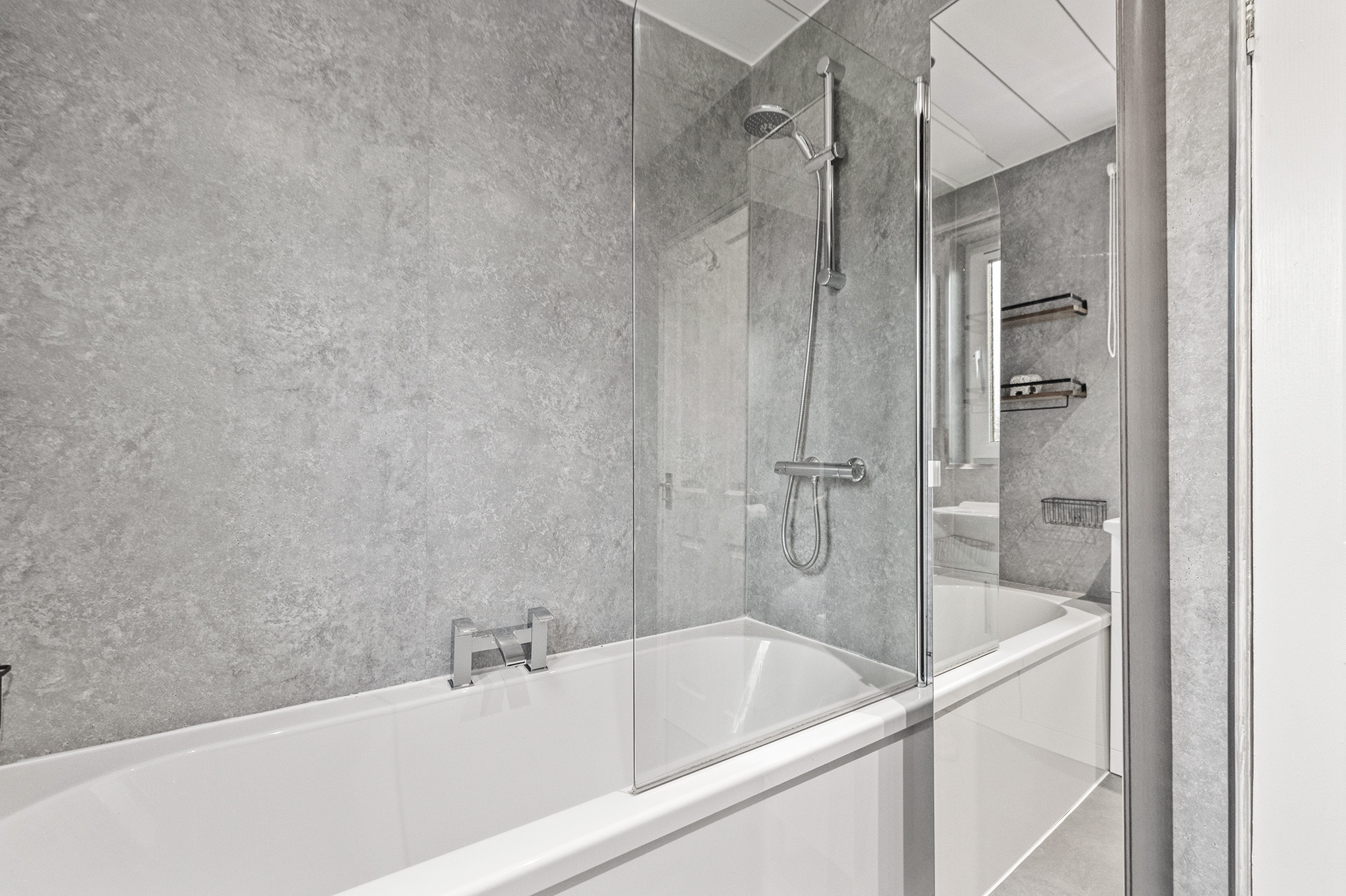 A contemporary family bathroom, finished to a high standard with modern wet wall, stylish fixtures, and a fresh, elegant feel.