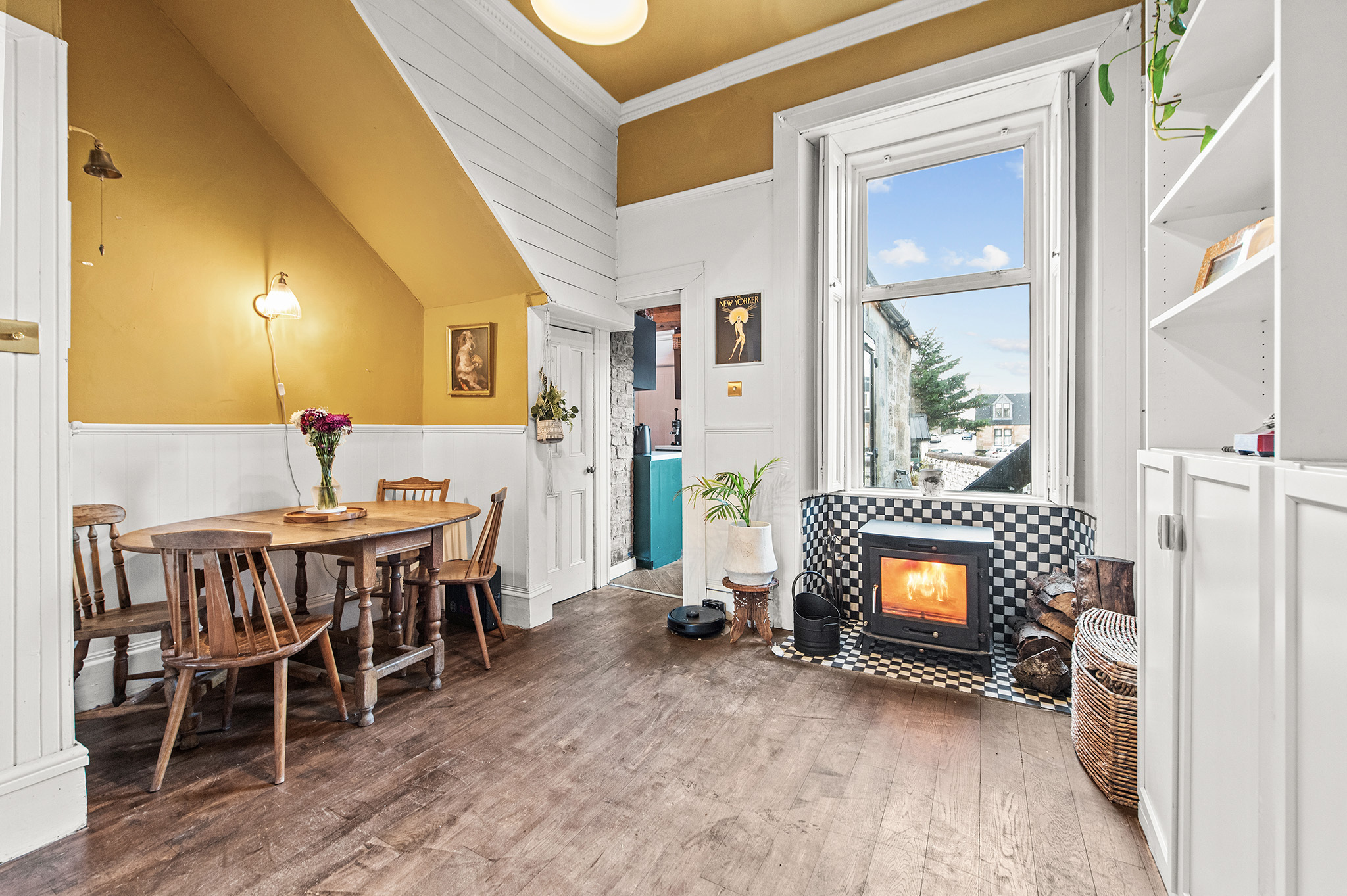 Beautiful dining space, centred around a cosy wood-burning stove, ideal for entertaining and family gatherings