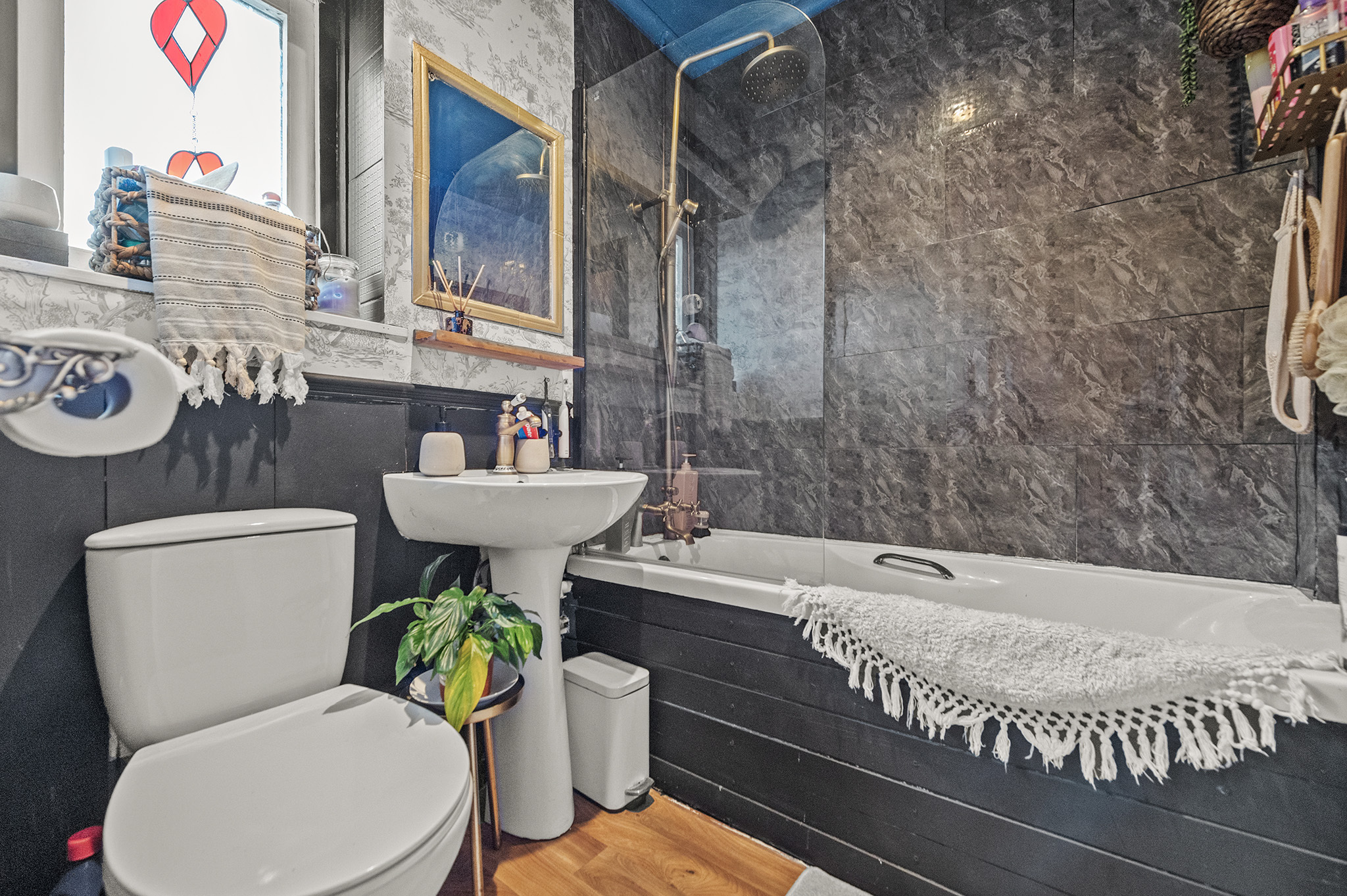 Modern family bathroom with three-piece suite and shower over bath