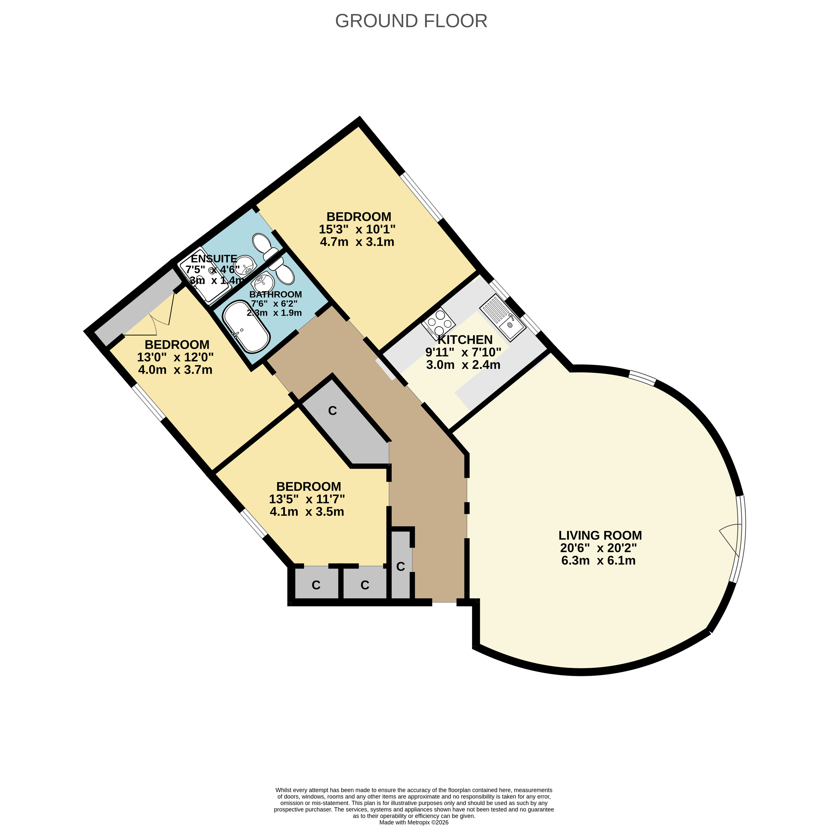 There are three generously sized bedrooms, two of which are well-proportioned doubles with fitted wardrobes, providing excellent storage.