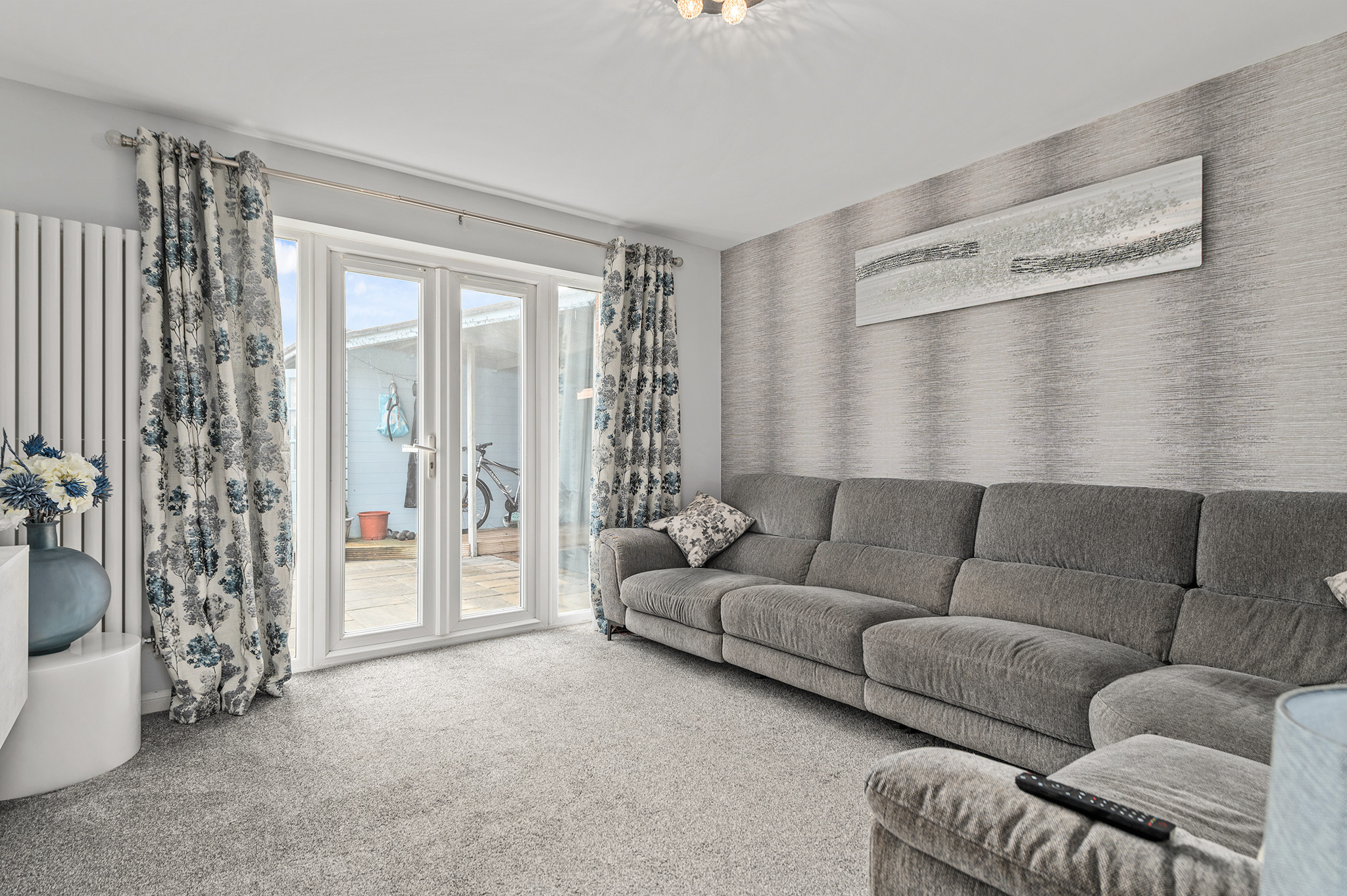 Spacious rear-facing lounge featuring French doors opening directly onto the garden, creating a wonderful connection between indoor and outdoor living.