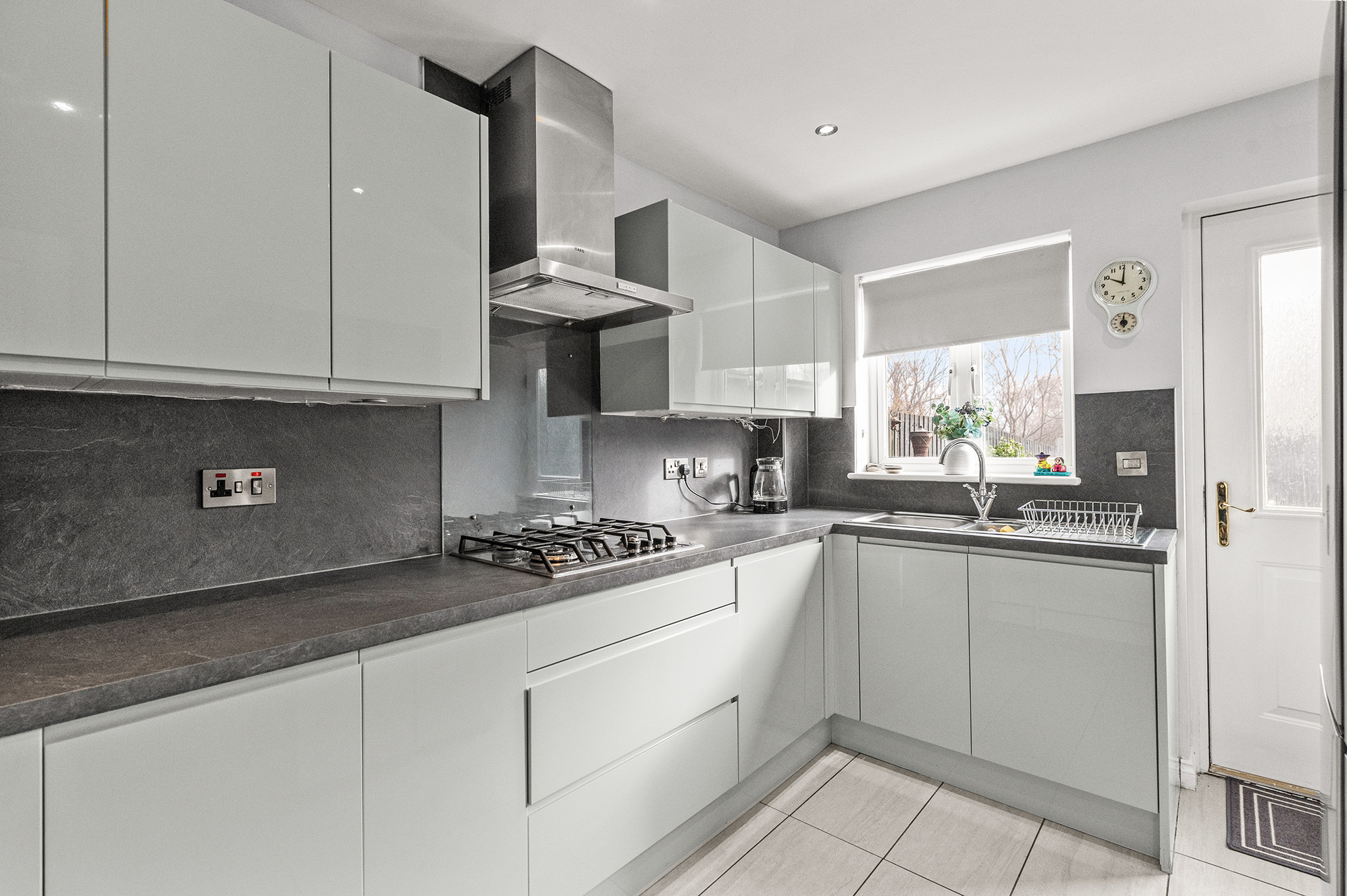 Well-appointed breakfasting kitchen with ample storage and workspace, complete with direct access to the rear garden.