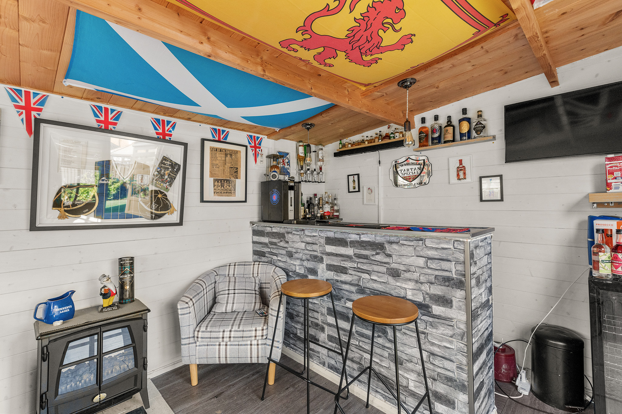 A standout feature of the garden is the exceptional summer house, currently utilised as a relaxing bar and entertainment space. This versatile structure could also serve as an ideal home office, gym, playroom, or creative studio.