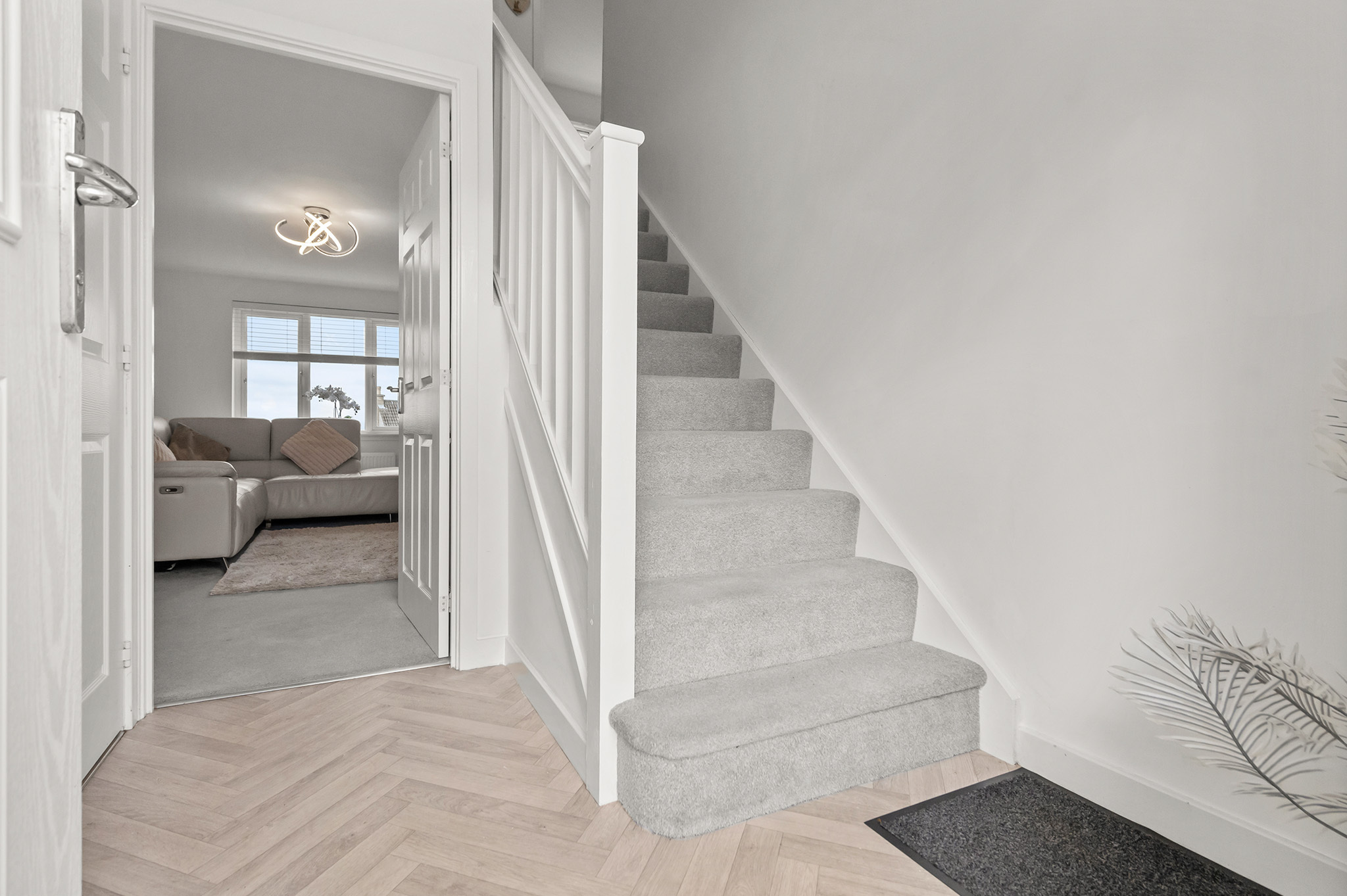 Bright and welcoming entrance hallway with staircase leading to the upper level.