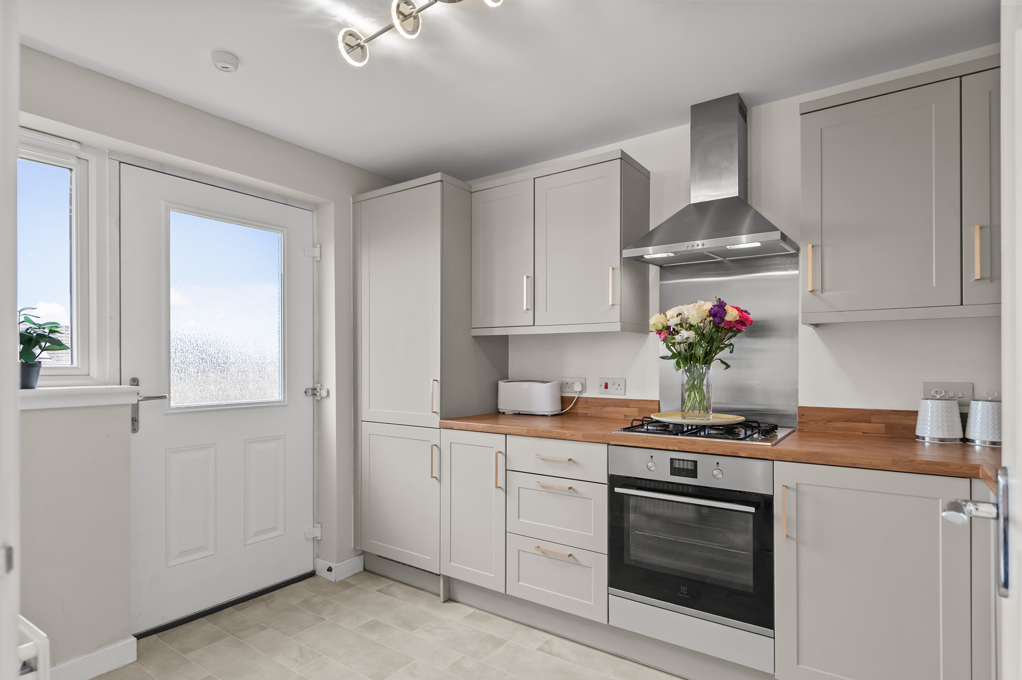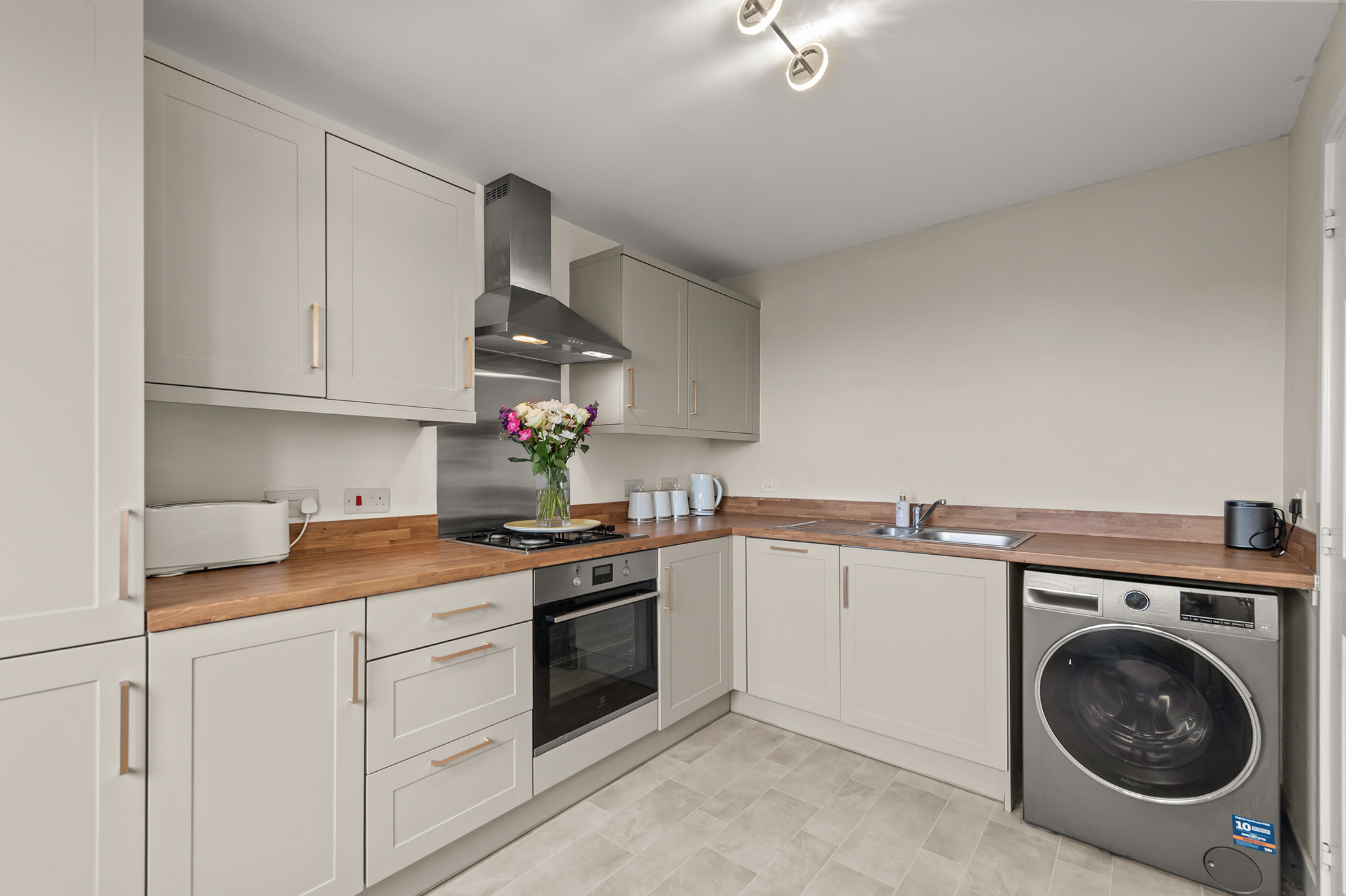 Stylish breakfasting kitchen, thoughtfully designed with modern fittings and ample workspace.